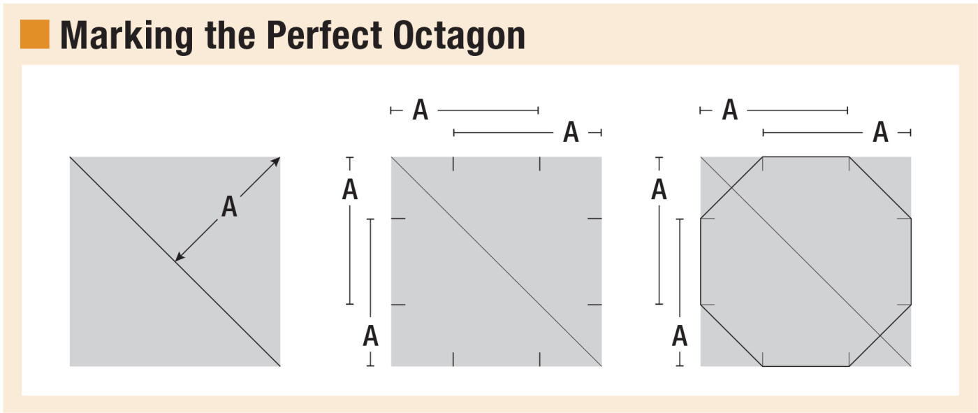 An easy way of laying out octagons is shown in these three steps and photos 8-10.
