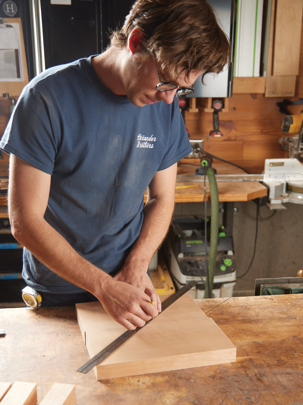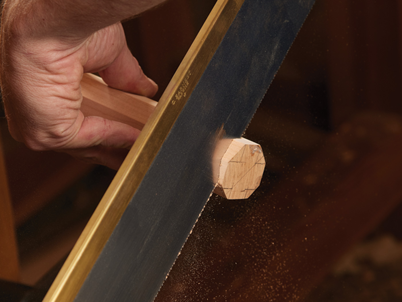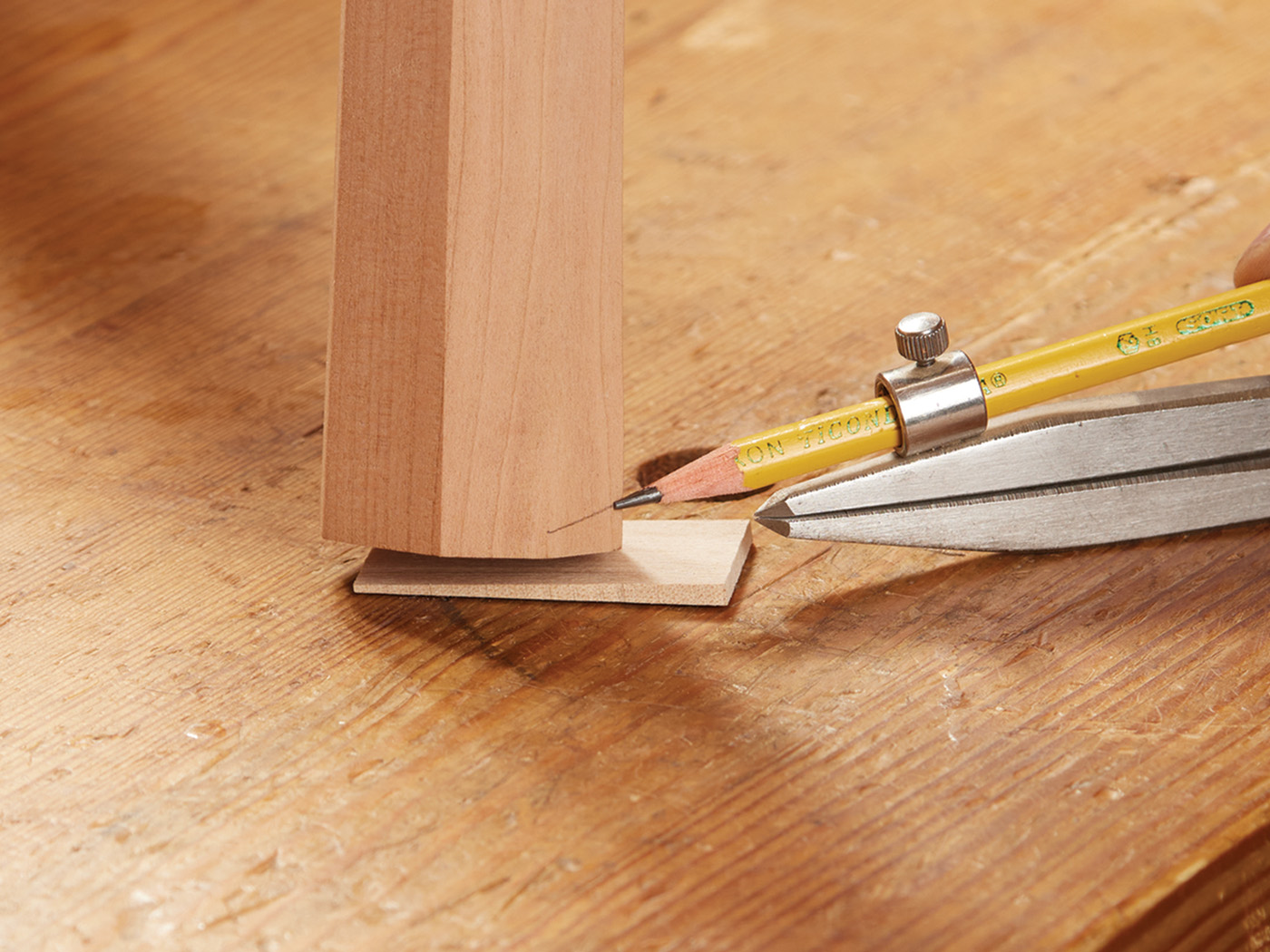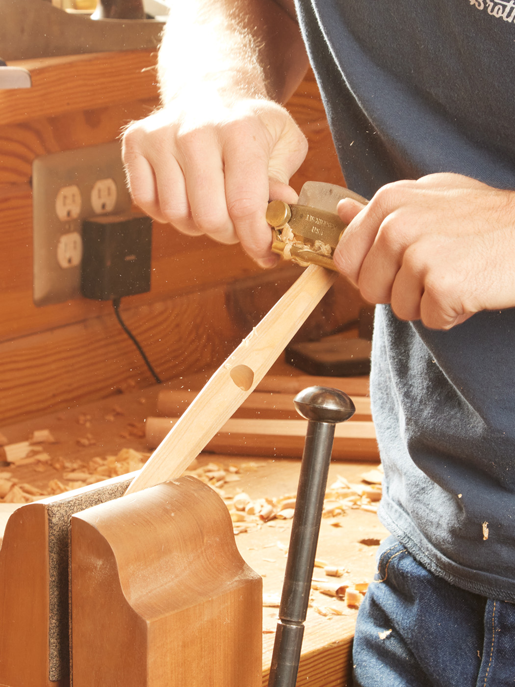 11 After laying out the octagon, it’s time to plane down to the line. I use a tapered jig to hold the legs, and that allows me to plane parallel to the bench.