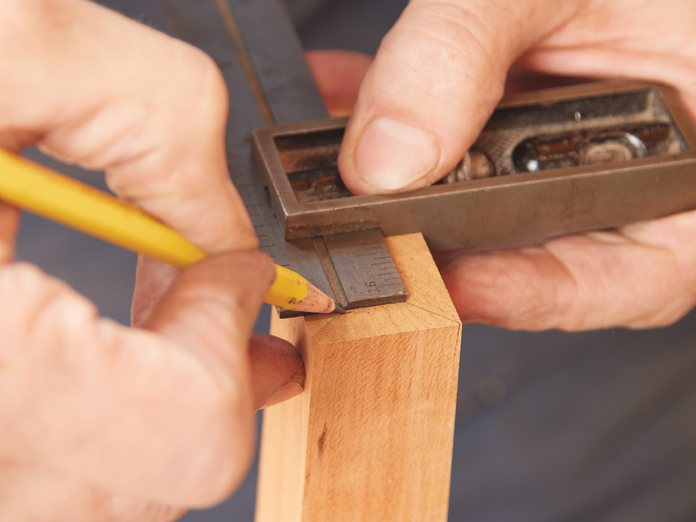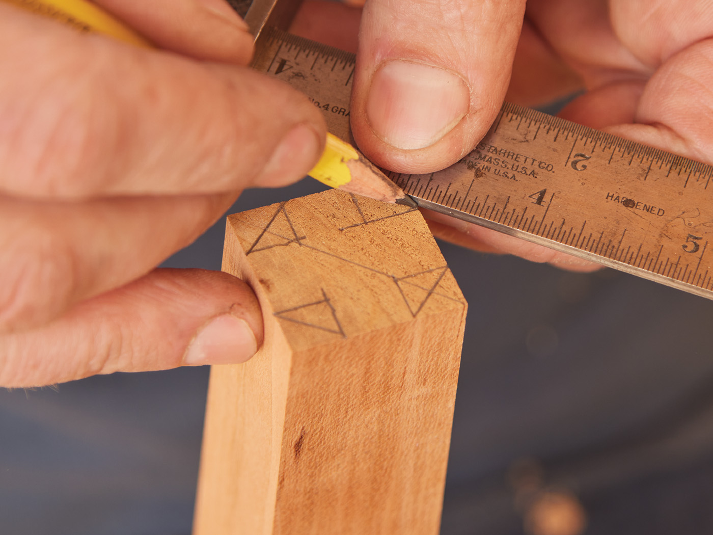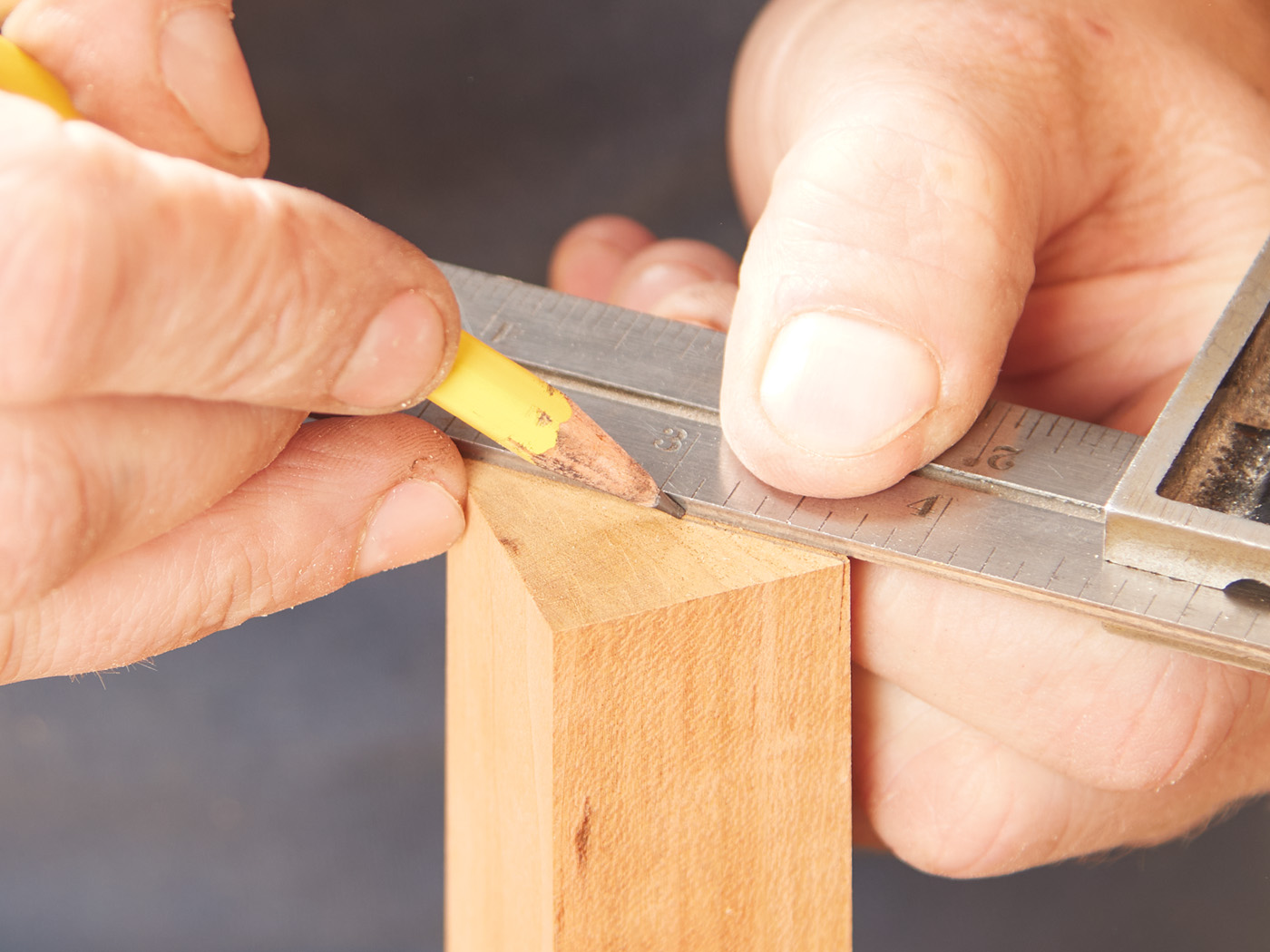 Start by clamping the leg in the vise with the end facing up. You will use a combination square and draw a single diagonal line from one corner to the other.