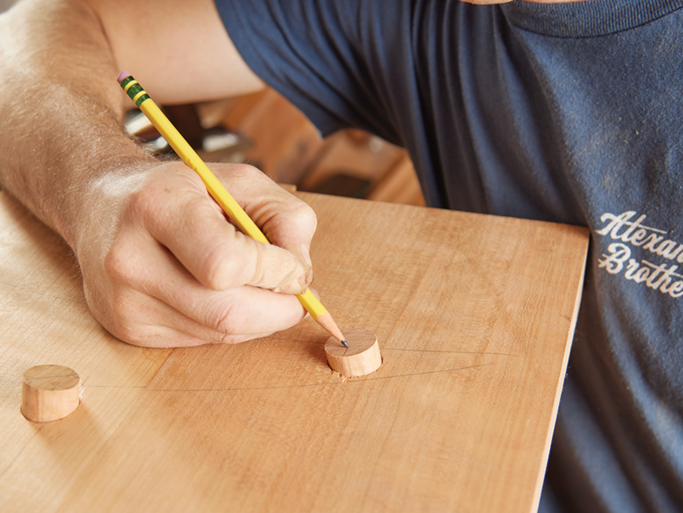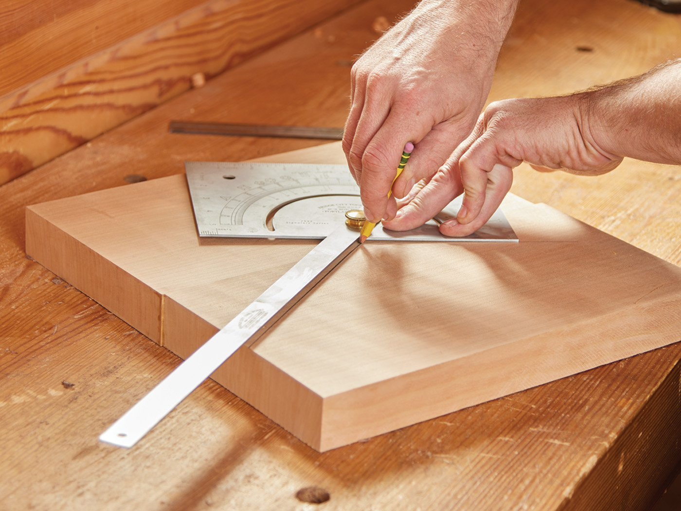 Next, you will mark the sightlines. These lines help guide you as you drill the leg mortises. Taking a ruler or straight edge, draw a line from the center point to the outside edge, intersecting all of the circles you previously drew. Then, using a protractor, lay out two or more lines radiating from the center 120° from this first line. Where these three lines intersect the circle you drew with the compass set at 4“ is the center point to drill for the leg mortises.