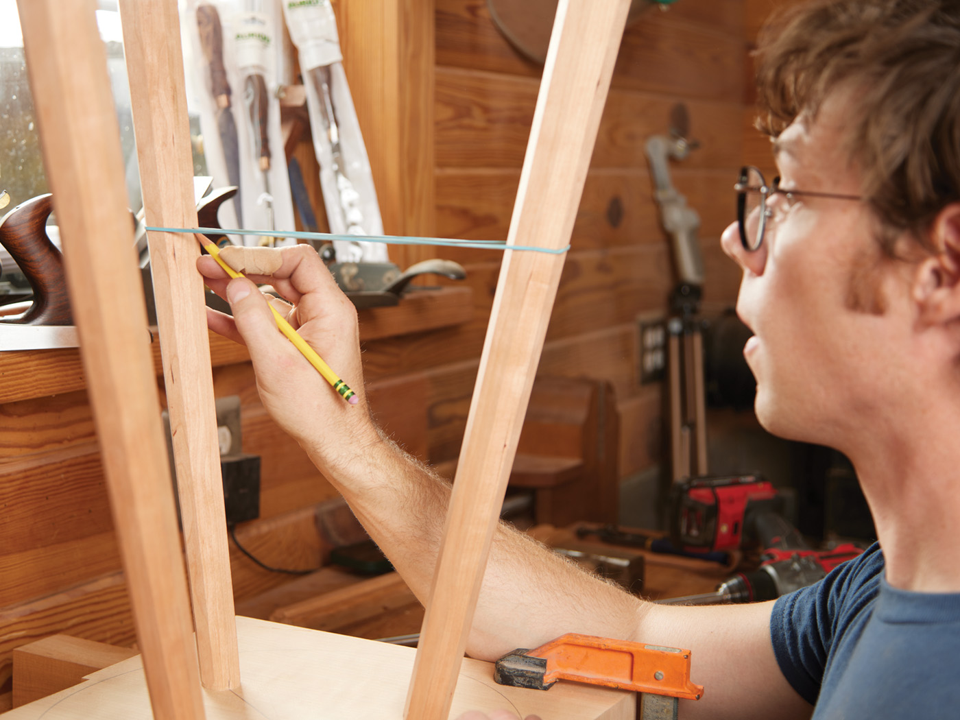 17 Use a rubber band stretched between the legs to layout the stretcher location.