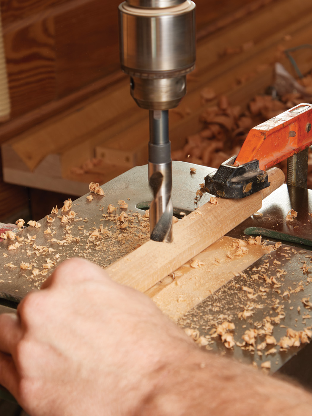18 Use a long bit and scrap to guide the bit and drill the mortise locations