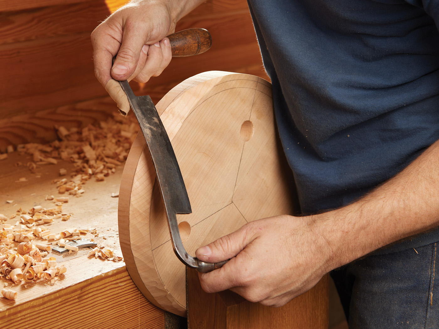 Once the top of the seat is shaped, you will cut out the circle shape of the seat to the circle line you marked with the compass set to 5-3/4“. This is best done with a bandsaw, but a good jigsaw or bow saw with a narrow blade will also do a great job. You will then clean up the outside saw marks with a spokeshave or sander. Next is the under bevel, setting the seat on edge and using a marking gauge or combo square set to 3/4“, you will mark a line around the edge of the seat 3/4“ off the bottom of the seat. Then, using a draw knife, you will connect this line with the circle line of the bottom that you drew with the compass set to 5“ to create a flat underbelly facet. I use the drawknife to get within 1/16“ of the lines and then work to the line with the spokeshave or the sander. Now on to the legs.