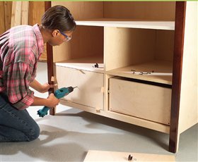 Attach the drawer faces to the drawer boxes with screws (Photo 13).