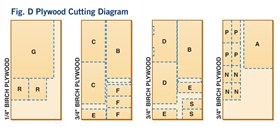 1. Cut out plywood parts A through G according to the Cutting List, and the Plywood Cutting Diagram, (Fig.D). Rough cut your sheets of plywood into manageable sizes with a jigsaw or circular saw, and then do the final cutting on your tablesaw. Use a router and straightedge on parts that are too big for your tablesaw.