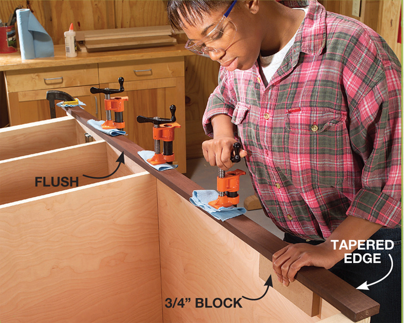 11. Glue and clamp the front stiles in place with the tapered edge facing out. Position the stiles flush with the inside of the drawer and components cabinet. Overhang the stile by 3/4 in. on the inside of the TV space.