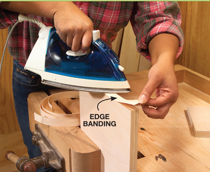 2. Edge band the plywood edges that will be visible when the project is complete (see Notes column in Cutting List). Pre-glued edge banding (see Sources,) is simple to apply with an old iron and easily trimmed with a utility knife (Photos 1 and 2). Rubbing the banding with a wood block helps it adhere to the plywood edge.