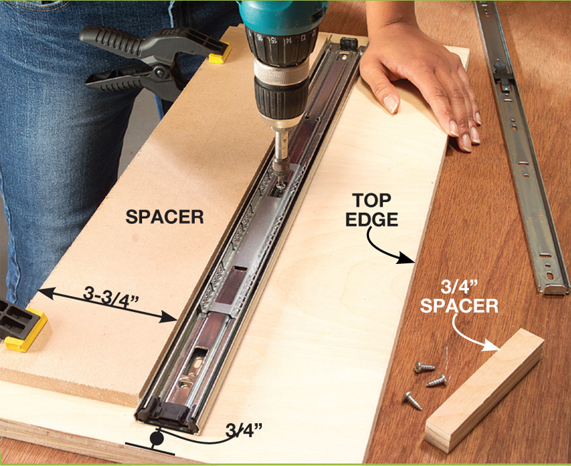 3. Screw the drawer slides onto the sides and center divider of the drawer section. It’s easier to do it now while the parts are lying flat. A spacer makes centering the slides foolproof. Set the slides 3/4 in. back to allow for the inset drawer faces