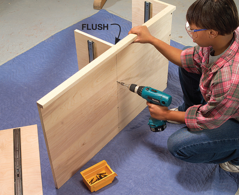 4. Assemble the drawer and component storage separately. Drill a pilot hole for each screw and make sure the front edges of the parts are flush.