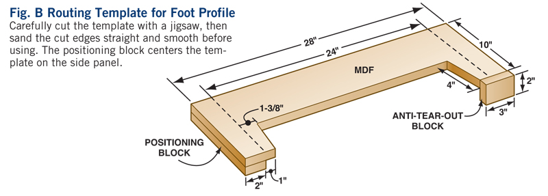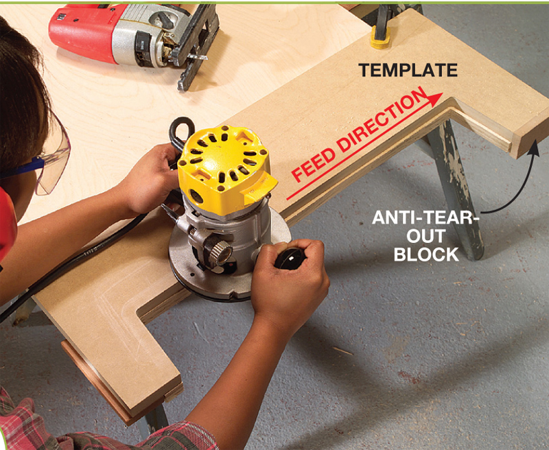 6. Rough cut the feet with a jigsaw and then trim the rough edge using a template and a pattern bit in your router. A small block glued to the right end of the template will prevent the plywood from tearing out at the end of the cut.