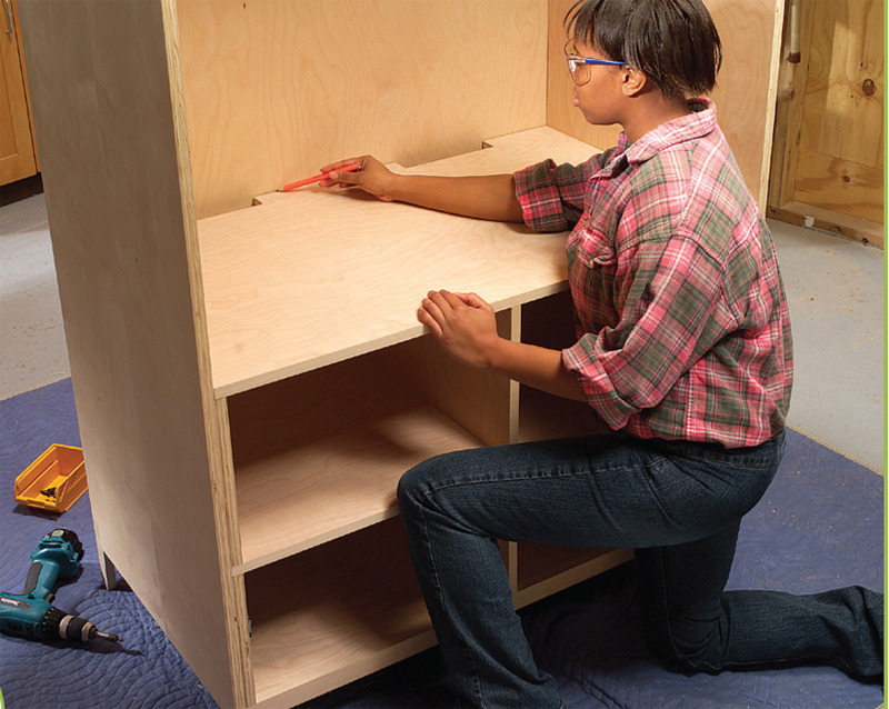 9. Screw on the back. Begin by fastening one edge with a few screws. Then nudge the unit one way or the other until you get equal diagonal measurements, which means it’s square. Then fasten the other edge, top, bottom and shelves with screws.