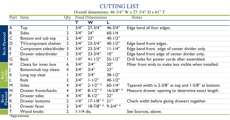 It takes only three sheets of 3/4-in.-thick plywood, one sheet of 1/4-in.-thick plywood and about 6 bd. ft. of lumber. Shop for plywood sheets that are similar in color and grain on at least one side and be sure to face these sides out when you build your cabinet. The sheet of 1/4-in. plywood for the back is less critical since it will be almost totally hidden once you install your TV and components.