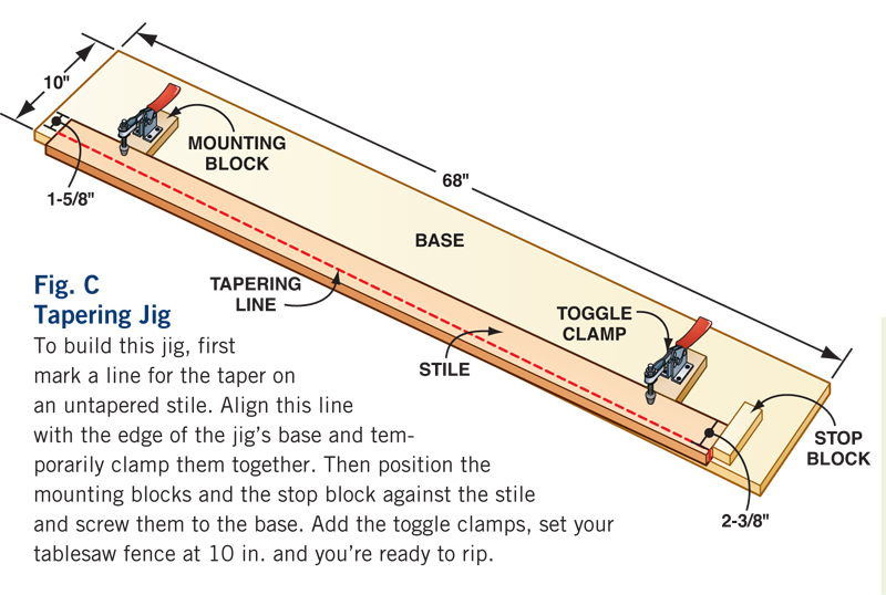 14. Build the stile-tapering jig (Fig. C). You’ll spend an hour making the jig, but it’s worth it, because it makes quick and easy work of tapering the stiles (M, Photo 10). Before you remove each stile from the jig, label the tapered edge. This taper must face out when attached to the cabinet and it’s easy to mix up the tapered edge with the straight edge. Completely sand the stiles at this time.