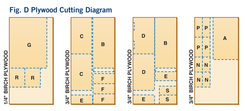 1. Cut out plywood parts A through G according to the Cutting List, and the Plywood Cutting Diagram, (Fig.D). Rough cut your sheets of plywood into manageable sizes with a jigsaw or circular saw, and then do the final cutting on your tablesaw. Use a router and straightedge on parts that are too big for your tablesaw.