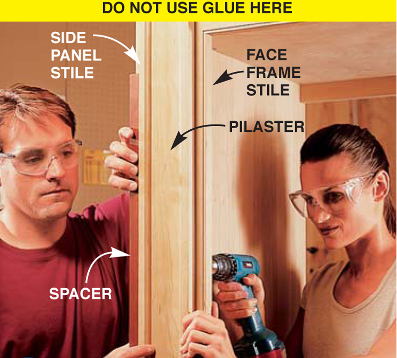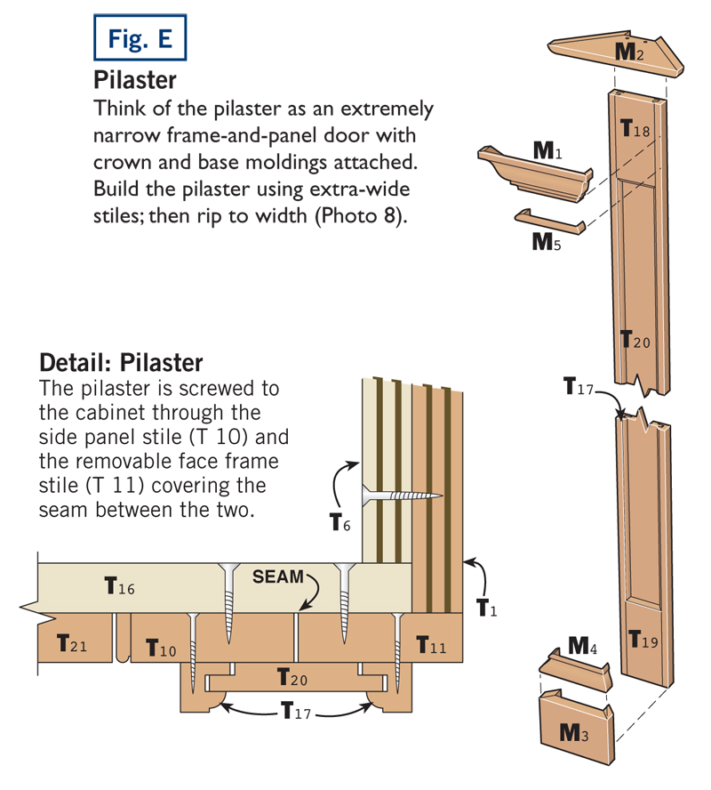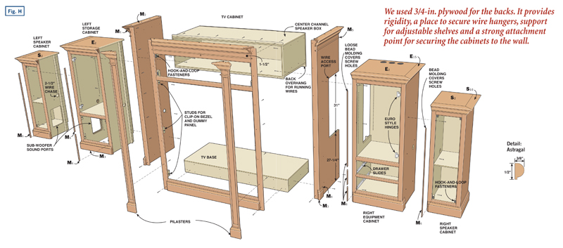 Beaded moldings and pilasters not only dress up the cabinet, but also hide screw holes and seams where the cabinets are joined together (Fig.H). We’ll show you how to handle the cove molding and introduce a construction technique that simplifies building large casework like this. You can build this home theater for about $2,000. That’s less than one-third the cost of manufactured cabinets of similar quality! Even so, this is not a beginner project. A familiarity with building panel doors and drawers as well as installing Euro-style hardware are a must (see For More Information, page 61). You’ll need a tablesaw, router, miter saw, jigsaw, planer, drill and a brad nailer to build this project. Installing a home theater may require hiring a pro to do the following: