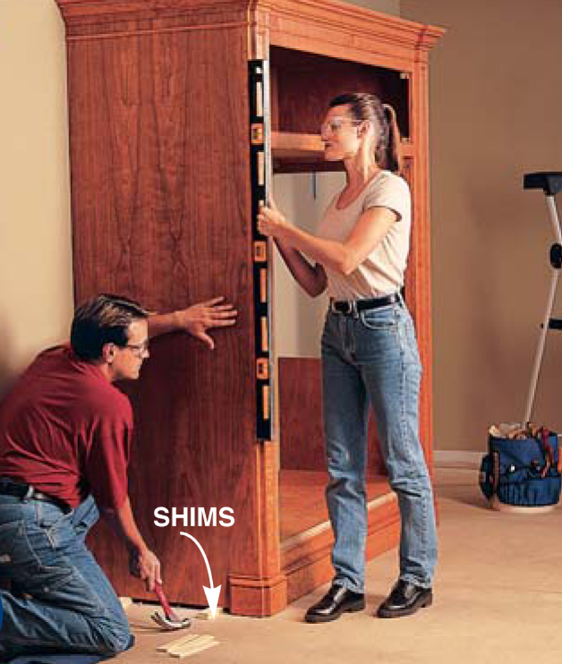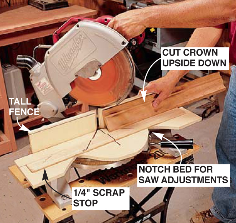1. Use a 6-in. x 16-3/4-in. scrap board to set the fixed shelves in the four side cabinets. Set the bottom shelf with the jig, then turn the jig lengthwise to set the middle shelf. 2. Rip the beading off a wide board. Run the bead on two edges of a wide board with a router and a 3/16-in. bead cutter. Rip the bead a little thick. Run the sawn edge of the bead through a planer to the desired thickness. The beading is a dual-purpose detail that runs inside all the face frame openings. It makes the cabinets look great while hiding the screw holes where one cabinet is joined to another (Photo 18 and Fig. H). 3. Nail on beading after clamping the face frame onto the inner box. Leave the beading loose on the stiles where the cabinet is screwed to the adjoining cabinet (Fig. H). 4. Fasten spacer strips on the inside face of the side panel.The spacer strips shim out the side panel so it can be glued flush to the face frame. 5. Drive screws (from inside the inner box) into the spacer strip after the finish panel is glued and clamped onto the face frame. 6. Use a template and a flush pattern bit to put a smooth edge on the cutouts (wire chases) on the adjustable shelves in the right equipment cabinet (Fig. D) as well as the access and sound ports in the cabinet sides. 7. Use a template to drill holes for shelf pins. Shelf pin spacing should be 3/4 in. to minimize wasted space between components. Add notches where the shelf rests on the pin to keep them from being inadvertently pulled out. 8. Rip the pilaster stiles down to their finished width of 3/4 in. after assembly.The extra width makes machining the stiles safer and easier. 9. Screw the side panels to the TV base box. Make sure the bottom edges are flush. Keep the screws back 5-in. from the front of the cabinet where the base molding will be attached. Screw the center channel speaker box to the sides from inside the box. Scraps of 1/2-in. plywood hold the interior boxes in position. Use #8 by 1-1/4-in. screws. 10. Set the face frame in the cabinet opening. Drive screws through the cleats on the center channel speaker box into the two upper rails to attach the top of the face frame and through the TV base box into the lower rail. 11. Attach the pilasters with screws from the back side of the face frames (see Detail: Pilaster, page 54) . A 3/4-in. spacer stick helps locate the pilaster on the stiles. 12. Attach crown cap with screws and glue. Don’t glue the mitered returns on the pilasters. They need to be removable for cabinet knockdown. 13. A shop-made auxiliary fence and bed simplifies cutting crown molding. Make the fence and bed from 1/2-in. plywood and attach it to your saw’s fence. Place the molding upside-down in the saw. Check to see that the two flats on the back of the cove are tight against the base and fence. Add a 1/4-in. stop on the miter saw’s bed to automatically position the crown and hold it securely in place for cutting. 14. Nail the crown bottom, into the cabinet side, and the top into the crown cap. 15. Mark your cuts with a utility knife. To safely cut the short returns around the pilasters, cut an inside miter on long stock and hold it in position on the cabinet for marking. Then, cut the short return off the long stock. 16. Hand pressure and a little glue are all that’s needed to make a strong, tight-fitting joint where the pieces are too small to nail. 17. Position the glued-up pilaster crown and nail it to the pilaster and cap. Remember to leave the glue out of these two miters so the pilaster can be removed for knockdown. 18. Screw together a side cabinet assembly using the already trimmed side panel of the TV cabinet as a starting point. (The loose bead molding will be used to cover the holes in the face frame after final installation). Trim the cabinets, with the moldings, being sure not to glue the joints where the cabinets break apart. 19. Screw the finished sides onto the two inner boxes to reassemble the TV cabinet. 20. Drop the face frame into place and secure with screws. 21. Add the pilasters and you’re done! 22. Use masking tape to mark the stud locations on your wall. (Use an electronic stud finder to locate the studs.) Mark the tape where you want the cabinets centered (red tape). 23. Level the TV cabinet with shims and fasten to the wall through the 3/4-in. back. 24. Tie down the loose-wire jungle at the back of the TV cabinet with cable straps and ties. 25. Label both ends of each wire with tags available from home centers and electronics retailers. 26. Roll the TV home. Here’s where your construction platform earns its keep a second time. The 3/4-in. skids bridge your platform to the TV base so you can roll the behemoth into the cabinet without damaging the cabinet, the TV or yourself! |