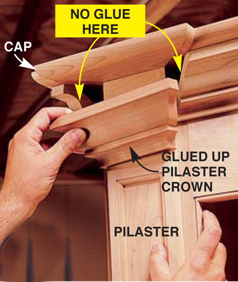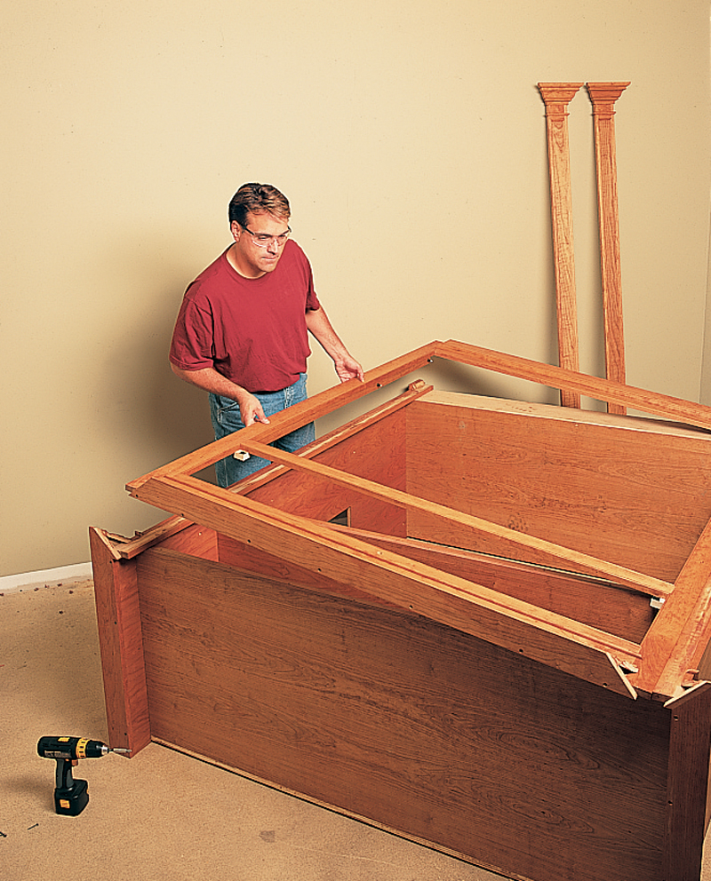 Add Face Frames and Side Panels4. Build the face frames and speaker cover frames. The front edges of the speaker frames have a 1/8-in. round-over and are painted flat black before they’re covered with fabric. 5. Machine the beading (Photo 2). 6. Attach face frames to the speaker and equipment boxes and nail on the beading (Photo 3). 7. Cut and rout the sound port in the cherry side panel (E1). 8. Attach spacer strips (G1 and G2) to the side panels (Photo 4). 9. Glue and clamp the front of the side panel to the face frame. Drill and countersink for 1-1/2-in. #8 screws to attach the panel to the inner box at the back (Photo 5). 10. Attach mounting strips (G3 and G4) to the TV side of the assembled boxes (Fig. B, C and D). 11. Cut out the wire chases in the equipment cabinet shelves (Photo 6) Tip: Use a 1/8-in. round-over bit to ease the edges of the 12. Drill out adjustable shelf-pin holes (Photo 7). 13. Make the drawers and false drawer fronts (Fig.C). PilastersLike the bead molding, pilasters have a dual role. They add visual interest to the monolithic front of the TV cabinet and they cover the seam between the removable face frame and the cabinet side stile (see Photo 8 and Fig. E). The TV CabinetRemember, the TV cabinet breaks down into seven pieces (Fig.H,page 62) so don’t use glue where any of these pieces are joined. 1. Assemble the center channel speaker box and TV base. 2. Glue and clamp side panel stiles (T11) to their respective sides (T1) (Fig. F). 3. Cut the access port in the right-hand side panel. 4. Assemble the TV carcass on its back (Photo 9). 5. Build and attach the face frame and beading (Photo 10). 6. Build the pilasters and while you’re at it, build the doors, TV bezel and dummy panel because they’re all made with the same stile-and-rail cutters. 7. Attach the pilasters (Photo 11). 8. Cut and attach crown cap with screws and glue (Photo 12). Note: Take care not to use glue where the joints disassemble (Fig.H). 9. Cut and attach crown molding (see Install the Crown Molding, page 57). 10. Finish trimming the TV cabinet and drill a 1/2-in.hole in the center of the upper rail (Fig. F) for the infrared remote. 11. Disassemble the completed TV cabinet. 12. Join one pair of side cabinets to a trimmed side panel of the TV cabinet (Photo 18). 13. Drill the wire-chase holes with a 2-1/2-in. hole saw. 14. Add the tops to the two cabinets and trim. 15. Disassemble the cabinets and repeat the process on the other side. 16. Disassemble, sand and finish the cabinets. We used Cherry Watco Danish Oil and a top coat of varnish. Tip: Build a 6-3/4-in. high, 30-in. x 66-in. assembly platform to bridge any unevenness in your floor. Even if you have a level floor, it’s nice to elevate the cabinets for trim work and you’ll use the platform again to get the TV into the finished cabinet (Photo 26). Install the Crown MoldingCompound miters and tiny returns make crown molding look hard to install. The truth is, with a utility knife and a simple shop-made auxiliary fence on a miter saw, the job is no more difficult than cutting simple miters for a picture frame. To cut crown, it has to be held upside-down on a miter saw, which is handy because you mark the crown for cutting on the bottom edge. Think of the bed on the miter saw as the cap and the fence as the cabinet side. For this size crown, the fence has to be taller so the molding can “bridge”between it and the bed.To properly support the crown molding for cutting you’ll need to build the simple auxiliary fence shown in Photo 13. Cut the long crown for the sides and front first. Mark, cut and fit the small pieces around the pilasters (Photo 15). The returns are too small to nail, so glue them up by hand (Photo 16), then nail up the larger piece (Photo 17). Tip: After cutting the short returns, hold the saw down until the blade stops turning or the spinning blade may catch the small piece and ruin it. Join the BoxesScrew together a side cabinet assembly using the already trimmed side panel of the TV cabinet as a starting point. (The loose bead molding will be used to cover the holes in the face frame after final installation). Trim the cabinets, with the moldings, being sure not to glue the joints where the cabinets break apart. InstallationIf your room is carpeted, roll back the carpet and pad so the cabinet can be installed on a solid surface. Remove the baseboard from the wall and reassemble the TV cabinet in the room. Lay out the stud locations and mark where the cabinet is to be centered on the wall (Photo 22). Level and mount the TV cabinet to the wall (Photo 23). (For more on installing cabinets see AW # 78, February ‘00, page 56). Install the remaining cabinets and anchor them to the wall. Reinstall the OK, now the fun really begins—installing the electronics. You’ll feel like a kid on Christmas morning unpacking all the equipment. Take your time and read the directions! They’ll save you headaches later on. WiringIt’s best to consult your electronics supplier for specifics regarding the wiring of your particular system. But, here are some tips to help prevent wire-management headaches. 1. Start by fishing the loose wires through the cabinet’s wire chases. Leave the wires a little long, you can always trim them later. 2. Use common electric-cable straps and cable ties to support the loose wire bundles that run behind the TV (Photo 25). 3. Label both ends of each wire for easy identification (Photo 24). Install the speakers and the electronic equipment in their respective places. (Remove the speaker covers that come with the speakers.) Give some consideration to the order in which you stack your electronic equipment: