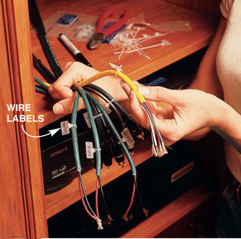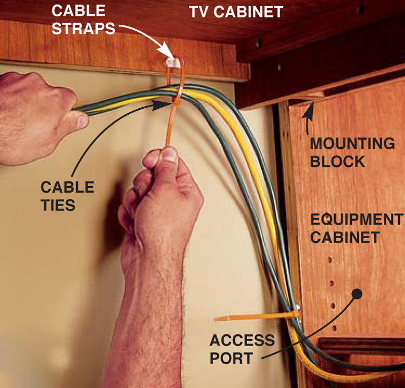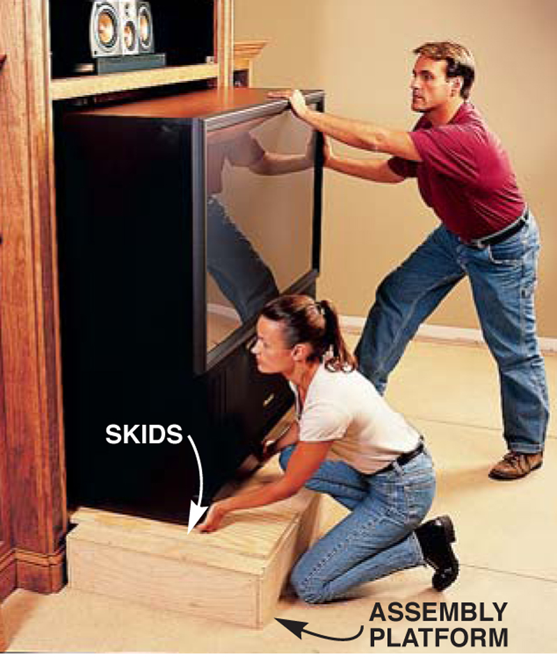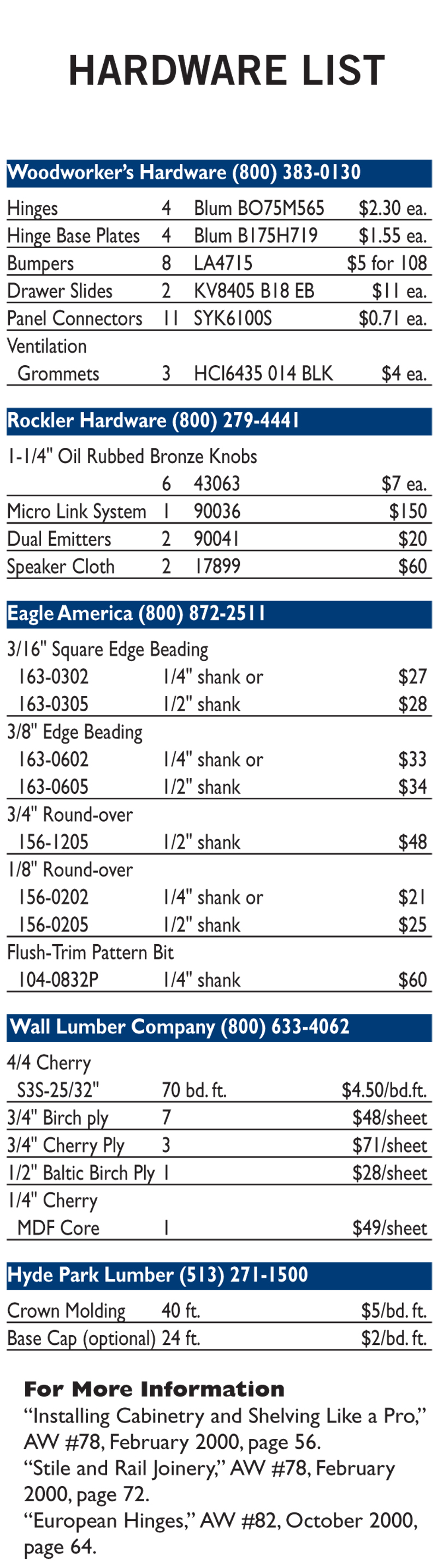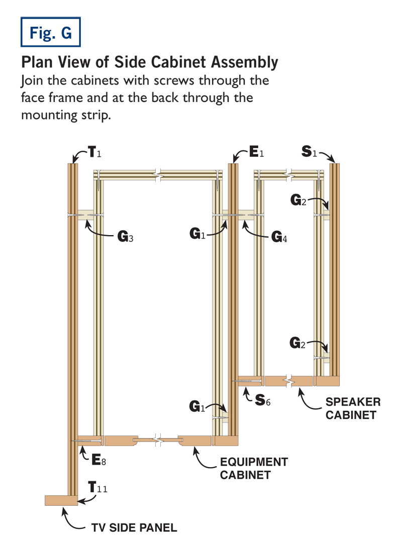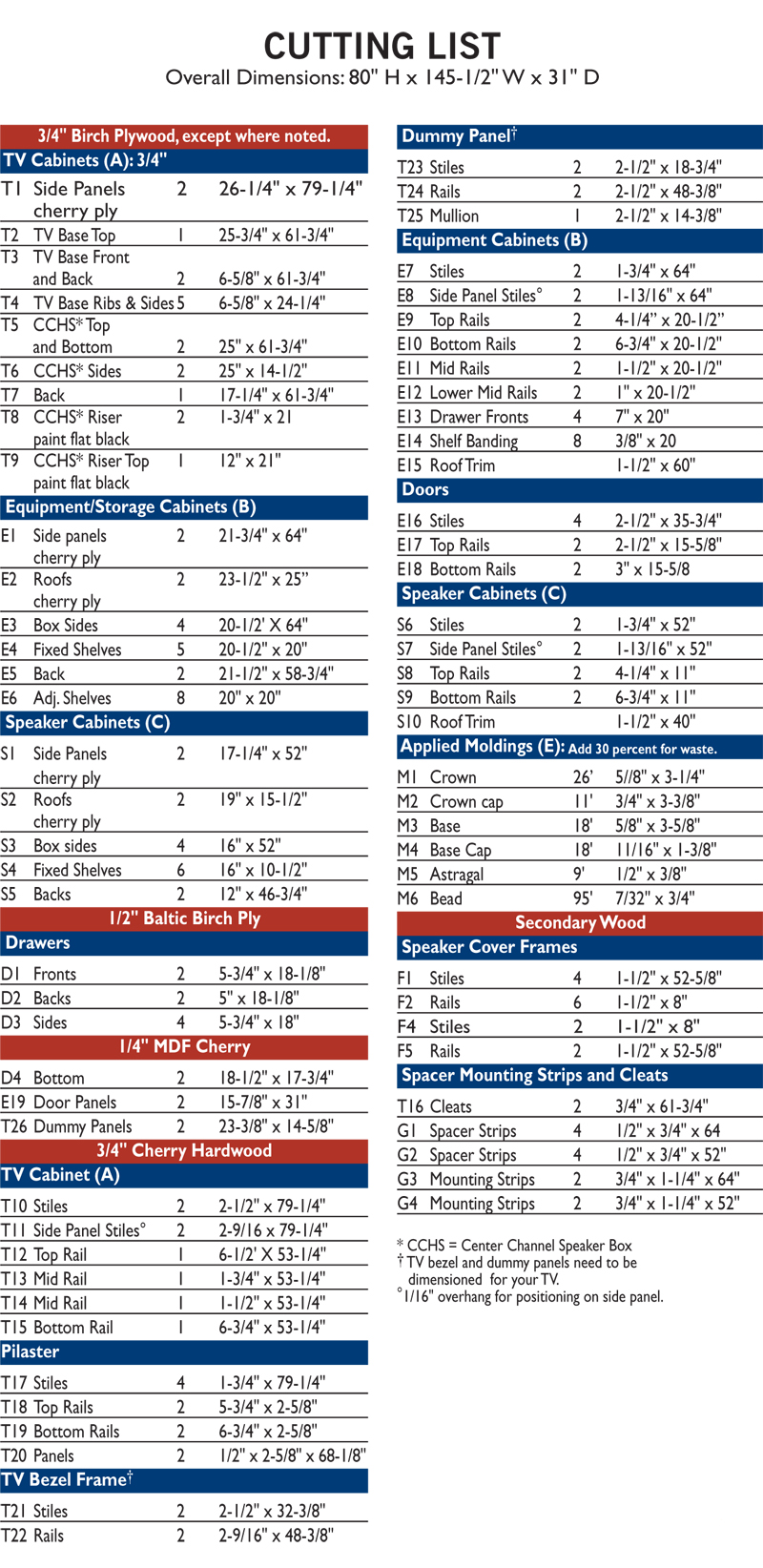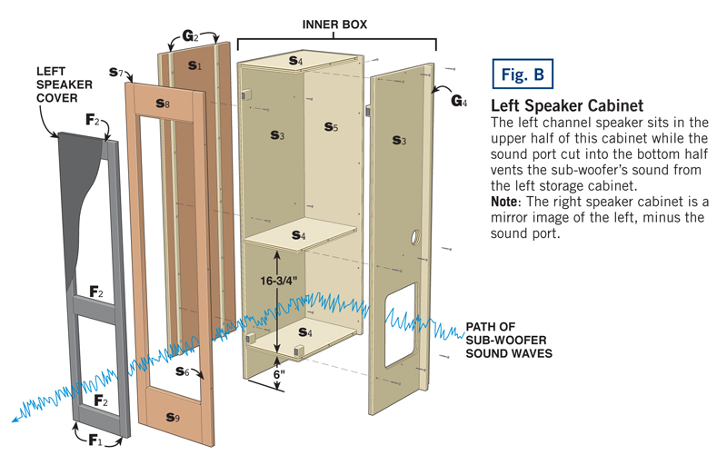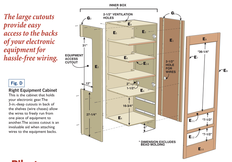 Man, all that equipment’s in place and ready to be hooked up. Now it’s time to bring in the main attraction; that giant TV! But first, run back to the shop and get that platform you built for assembling the cabinets. Place it in front of the TV cabinet and add a couple of 3/4-in. skids that run from the platform and butt into the front edge of the TV base. Set the TV on the skids but leave enough room to get behind the TV to attach wires. Once the wiring is complete, the TV can be rolled into the cabinet (Photo 26). Put up the speaker covers and snap in the TV frame and dummy drawer panel and you’re ready to go. Now, you just have to figure out how to program that VCR! Tip: Use cable straps and cable ties to tame the wire jungle. Sources(Source information may have changed since the original publication date.) Woodworker’s Hardware, 800-383-0130. Eagle America, 800-872-2511. Wall Lumber Company, 800-633-4062. Rockler Hardware, rockler.com, 800-279-4441. Hyde Park Lumber, 513-271-1500. Cutting ListHardwareFig. A: Exploded ViewFig. B: Left Speaker CabinetFig. C: Left Storage CabinetFig. D: Right Equipment Cabinet