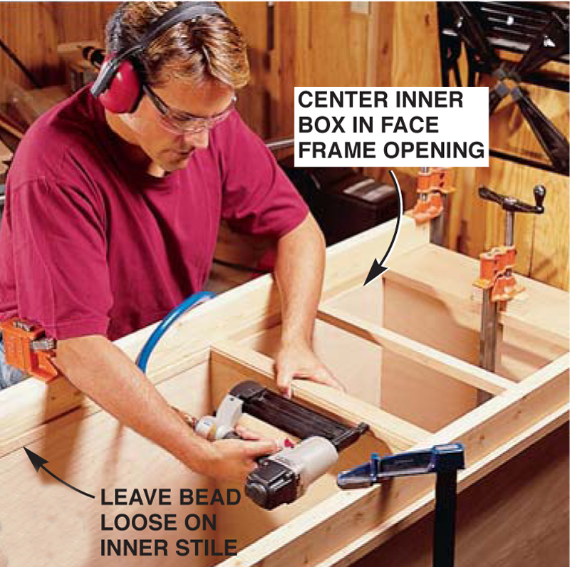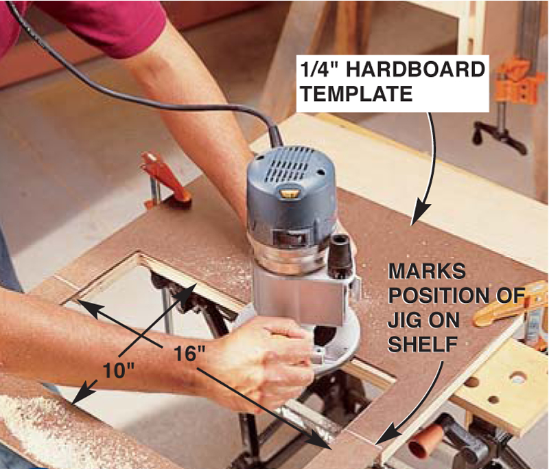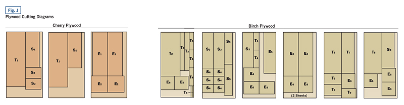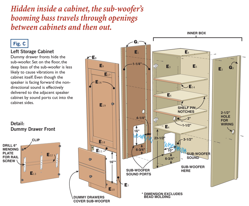 Design ConsiderationsWe went all out with this home theater. It’s 12-ft. long with room for a 53-in. projection TV, all the electronic gear a person could wish for and tons of storage space. The surround-sound system consists of five speakers: left and right channel speakers, a center channel speaker, a sub-woofer and two surround speakers. The speaker cabinets not only hide the speakers, but keep them up off the floor for maximum sound quality. The sub-woofer sits on the floor behind a dummy drawer bank in the storage cabinet.The sound is vented through the side of the cabinet into the lower section of the speaker cabinet. Too Big for Your Living Room?You can easily downsize the unit to about 7 ft. 3 in. by dropping the equipment and storage cabinets. Your electronic gear can be kept anywhere as long as it can be wired to the infrared remote sensor in the TV cabinet (Fig.F). A closet, another wall in the room or even a different room are all possibilities. The non-directional sub-woofer can also go anywhere in the room. Unique ConstructionA professional builder and installer of home theaters developed the construction technique we used. Each cabinet has an inner box made from less expensive birch plywood and joined with butt joints and screws. Only the inside of the box is visible while the exposed sides are covered by an adjoining cabinet or sheathed with cherry plywood (Fig.G). The box interior is essentially flush with the face frame opening. This gives a clean look to the inside while providing an ideal surface for mounting Euro-style cup hinges and drawer slides. The face frame is wider than the inner box, so it extends beyond the sides by 1-1/16 in.One stile butts up to the side of an adjoining cabinet while the other receives a finished cherry side panel. All the moldings are shop-made with the exception of the crown and base cap. If you’re planning to make the home theater a built-in, consider ordering enough base and base cap to replace the existing baseboard in the room. The Equipment and Speaker CabinetsThe basic design is five cabinets strung together and adorned with moldings. The big TV cabinet is built in pieces and assembled in its final location. Build the Inner Boxes1. Cut the 3/4-in. sheet stock and hardwood according to the Cutting List, page 61. 2. Assemble the birch inner boxes for the four side cabinets. (Photo 1 and Figs. B,C and D). 3. Rough-cut the sound ports in the left storage and speaker cabinets (Figs. B and C) and the wire access opening in the right equipment cabinet (Fig.C) with a jigsaw. Use the template shown in Photo 6 and a router to smooth the edges.