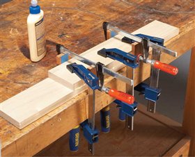 1. Use plenty of clamps to glue the pieces together. Place two clamps across the pieces to help align them. To prevent these clamps from sticking to the wood, place some small blocks, covered with masking tape, between the wood and the clamp.