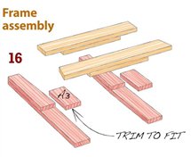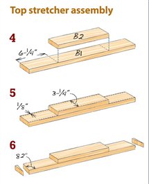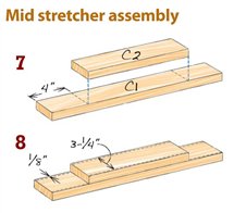 When you’re ready to assemble the frame in step 16, place the stretchers in position and measure the distance between them. Cut A3 to this length. You can glue all of these pieces together at once, but it’s easier to do it in two stages. Start with the middle stretcher, but leave the top stretcher in place—without glue—so the legs are spaced correctly. Draw all the pieces tight with clamps. For the second stage, glue on A3 and the top stretcher. After removing the clamps, cut part B3 to exact length.
