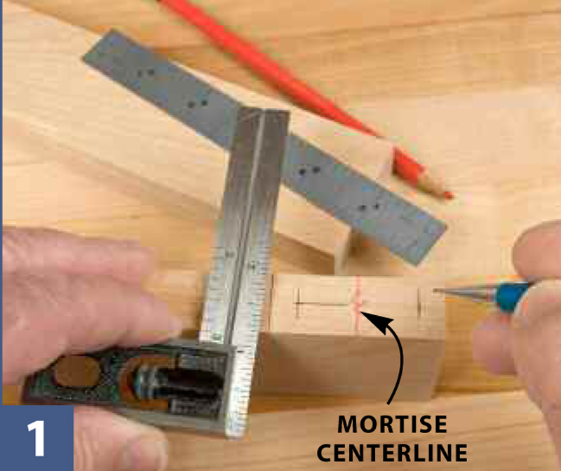 1. Lay out one edge mortise on a test piece to set up the router and jig.The mortise centerline is used for positioning the workpiece on the mortising block—it’s the only layout mark required for every mortise.