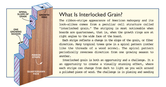 The ribbon-stripe appearance of American mahogany and its look-alikes comes from a peculiar cell structure called “interlocked grain.” The striping is most noticeable when boards are quartersawn, that is, when the growth rings are at right angles to the wide face of the board.