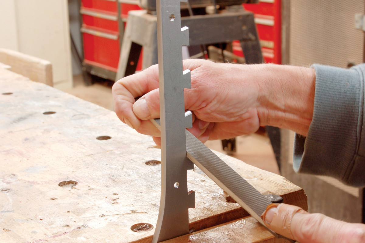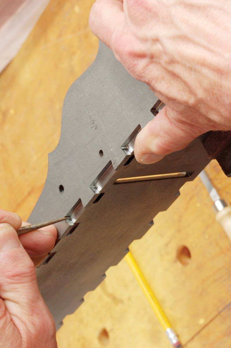 The dovetails on the shell’s side pieces were laser cut, so the edges were easy to clean up with a file (Photo 2). The pins on the sole, however, were only approximations, so I placed each side in position on the sole, and marked the dovetail angles on the pin stock with a sharp stylus (Photo 3). Then, I filed the pin stock to the mark. A single morning’s labor resulted in tight-fitting dovetails on both sides of the plane, dovetails remarkably like those I cut in wood.