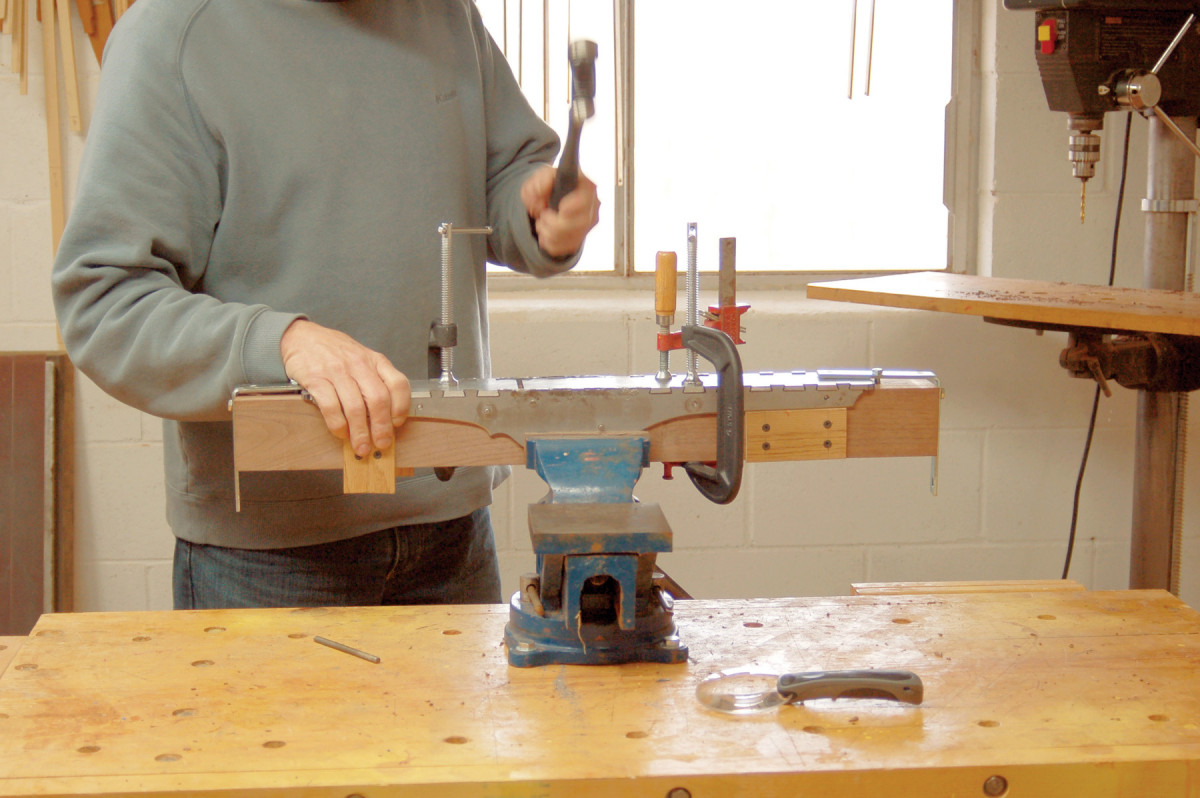 I also had to make a wooden buck to support the shell during the hammering process (Photo 5). The buck had to precisely fit inside the shell, to keep it rock solid. The buck was drilled to receive the steel rods that would later be used as rivets, and blocks were screwed on to support the edges of the shell sides. I also lag-bolted “L” brackets to each end, pulled down tight against the sole and torqued C-clamps around each area I intended to hammer. I repositioned these clamps each time I moved to a new pin or dovetail.