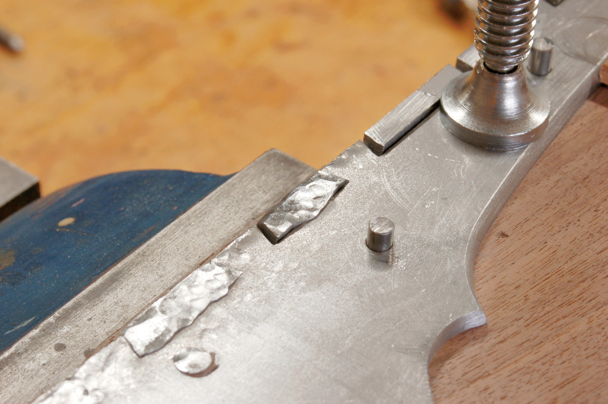 But that’s only part of the story. In wood, dovetails lock a joint in only one direction—glue is required fix the joint in the other direction. Dovetails in metal are engineered to lock the joint in both directions without glue. In fact, the whole business of dovetailing an infill plane shell is based on the fact that cold, hard steel can be made to flow. The pins and dovetails are all cut a bit long, so they protrude when the joint is assembled. In addition, both shoulders of each dovetail are beveled, so gaps appear in the assembled joint. The protruding ends are then beaten into the bevels with a ball peen hammer, to tightly lock each dovetail in both directions. Hammering also fills any tiny gaps left between the sole and the sides.