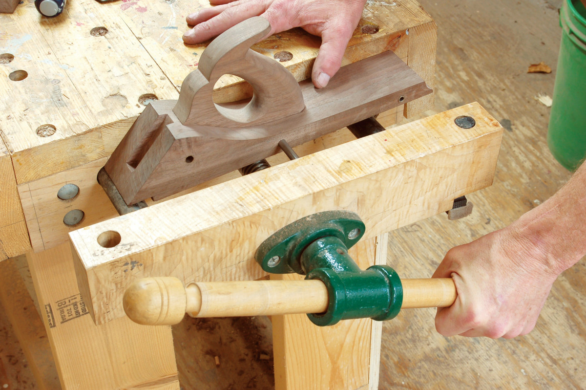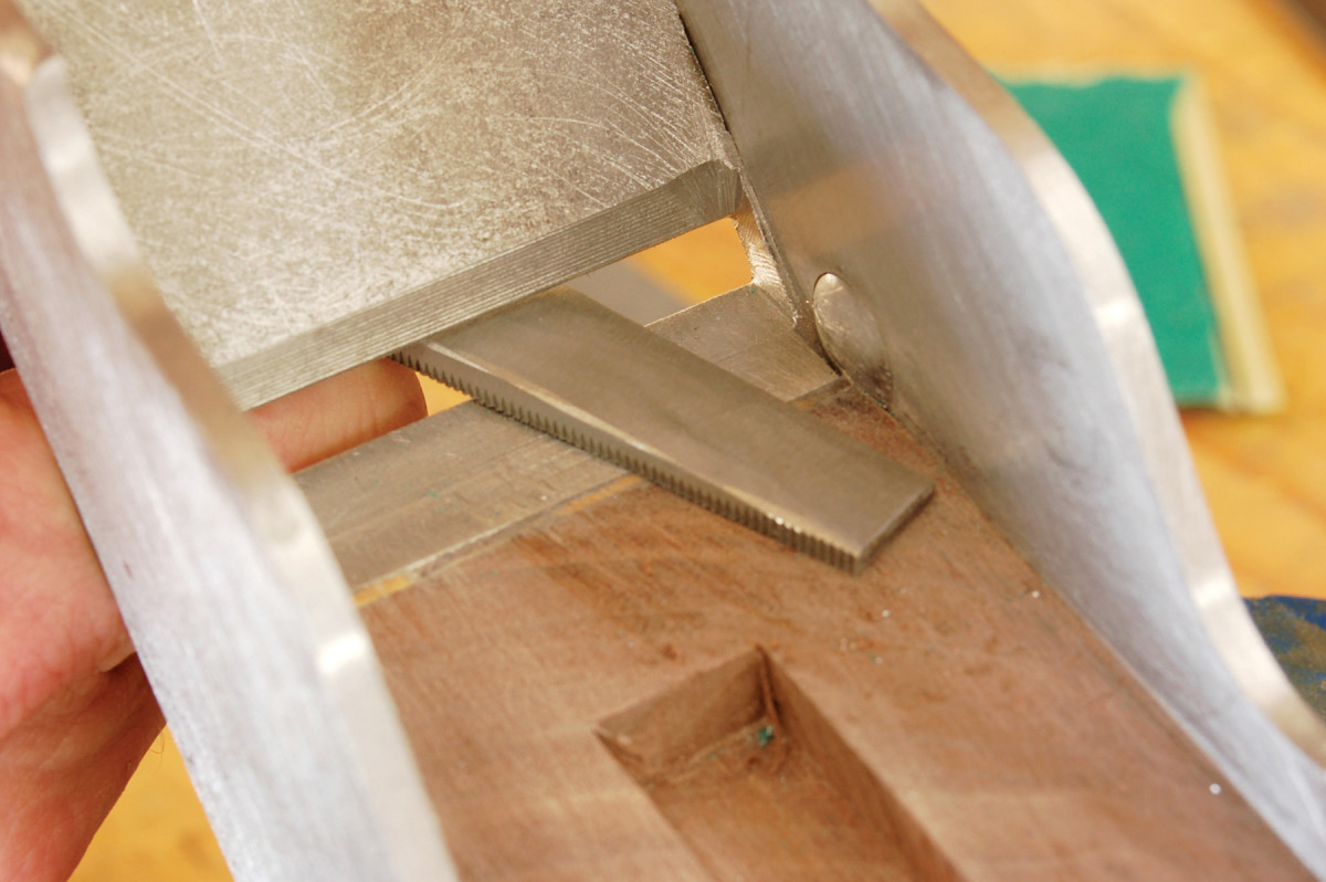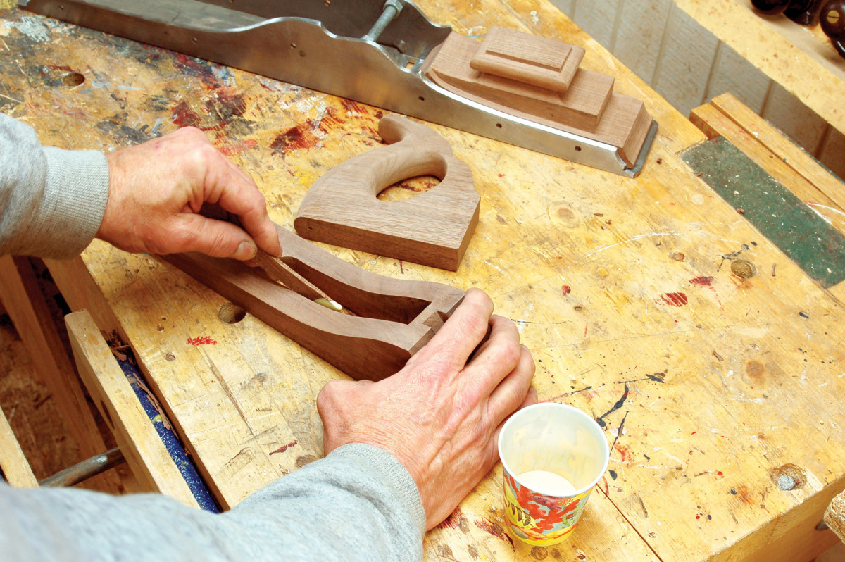 I planned to use locally harvested walnut for the infill and I’d decided to build a plane without a blade adjuster, because I wanted to include the attractive bandsawn line at the front of the tote that’s typical of adjuster-less planes. That line is lost on planes with adjusters, because the front edge of the tote is mortised to house the adjuster. I finally settled on a design similar to the tote and frog on a large Spiers panel plane I that owned (Photo 8).