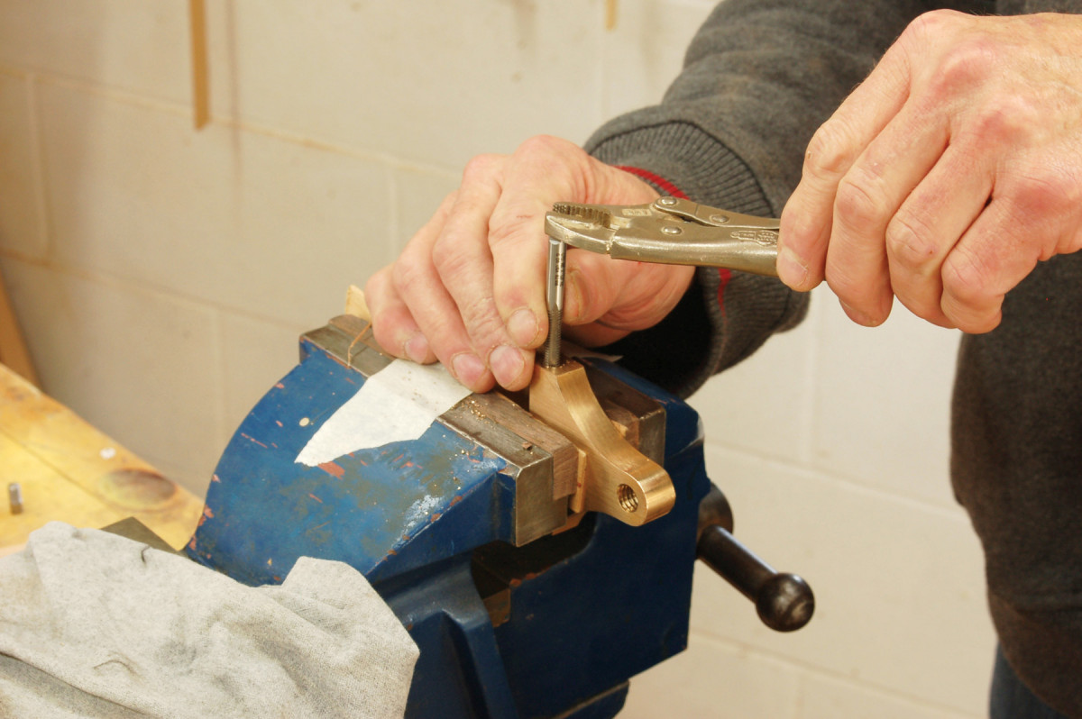 Constructing this plane took far longer than I expected, because, except for fabricating the wooden infill parts, every process was new to me. Even drilling the six rivet holes through their bushings was a challenge that stretched out over most of a day, because I struggled to find a workable method (Photo 9). And it wasn’t until I drilled the last hole that I felt like I knew what I was doing. Fitting the infill pieces went smoothly (Photo 10), but tapping the mounting holes in the lever cap was another story (Photo 11).