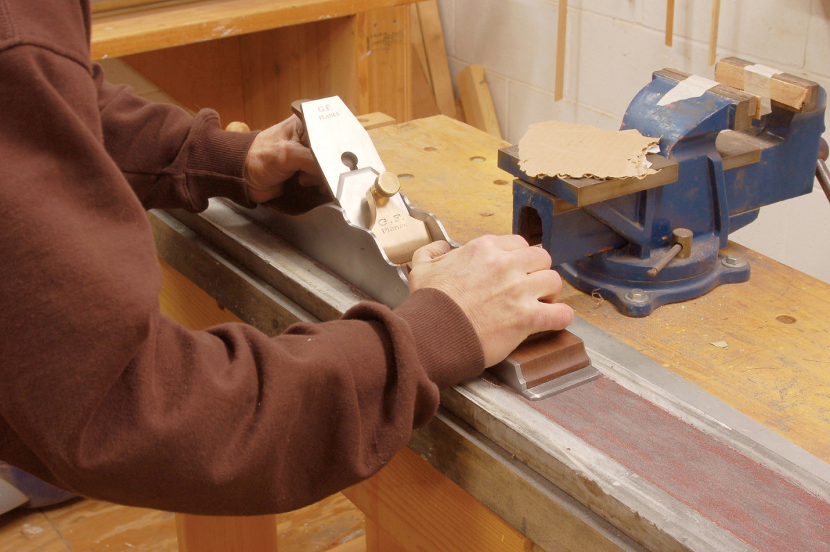 Lapping is hard work, because you have to apply constant downward pressure as you slide the plane back and forth on the abrasive to remove metal. As an amateur plane maker, I probably pushed down harder than necessary—hard enough to make the muscles in my chest and shoulders burn.