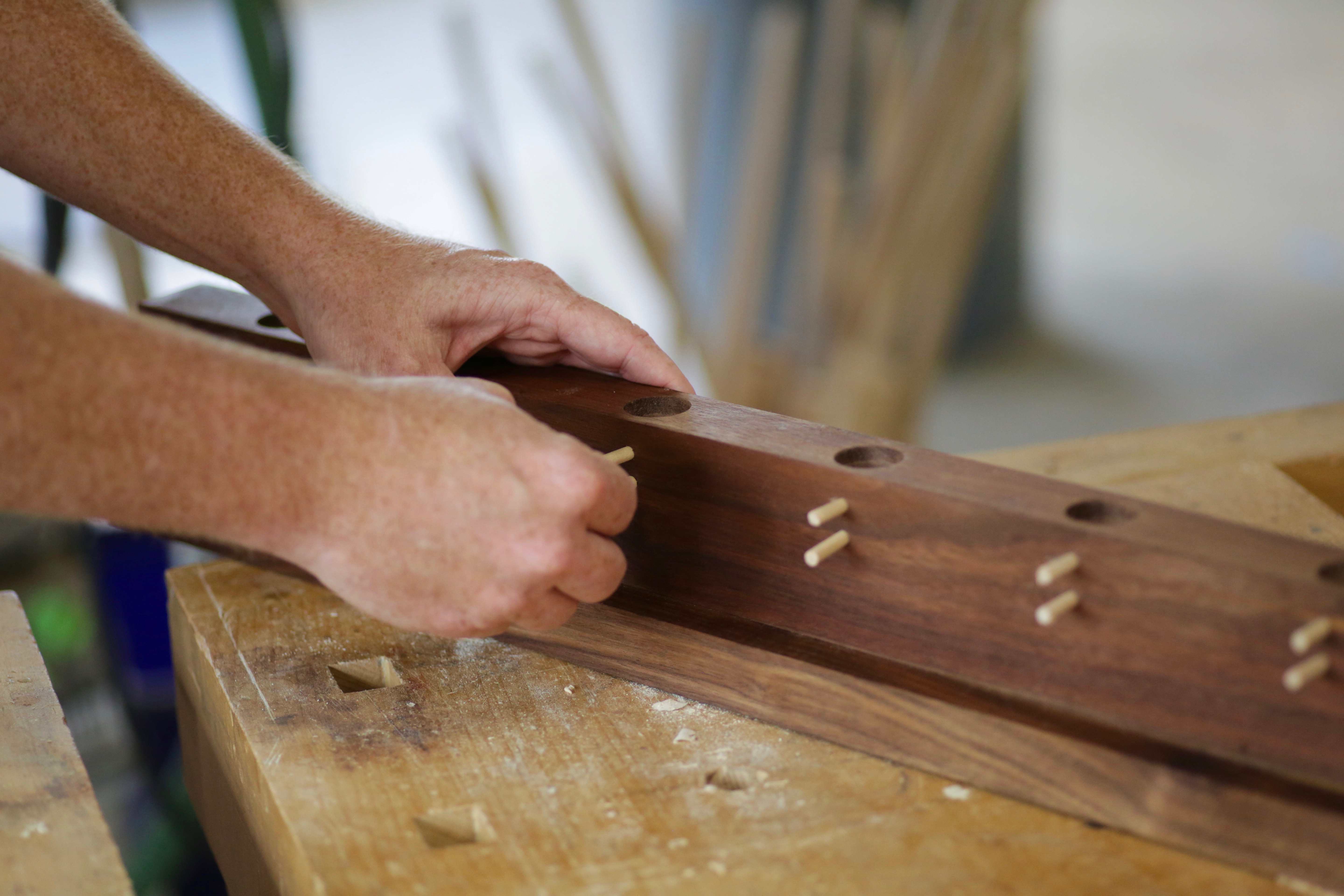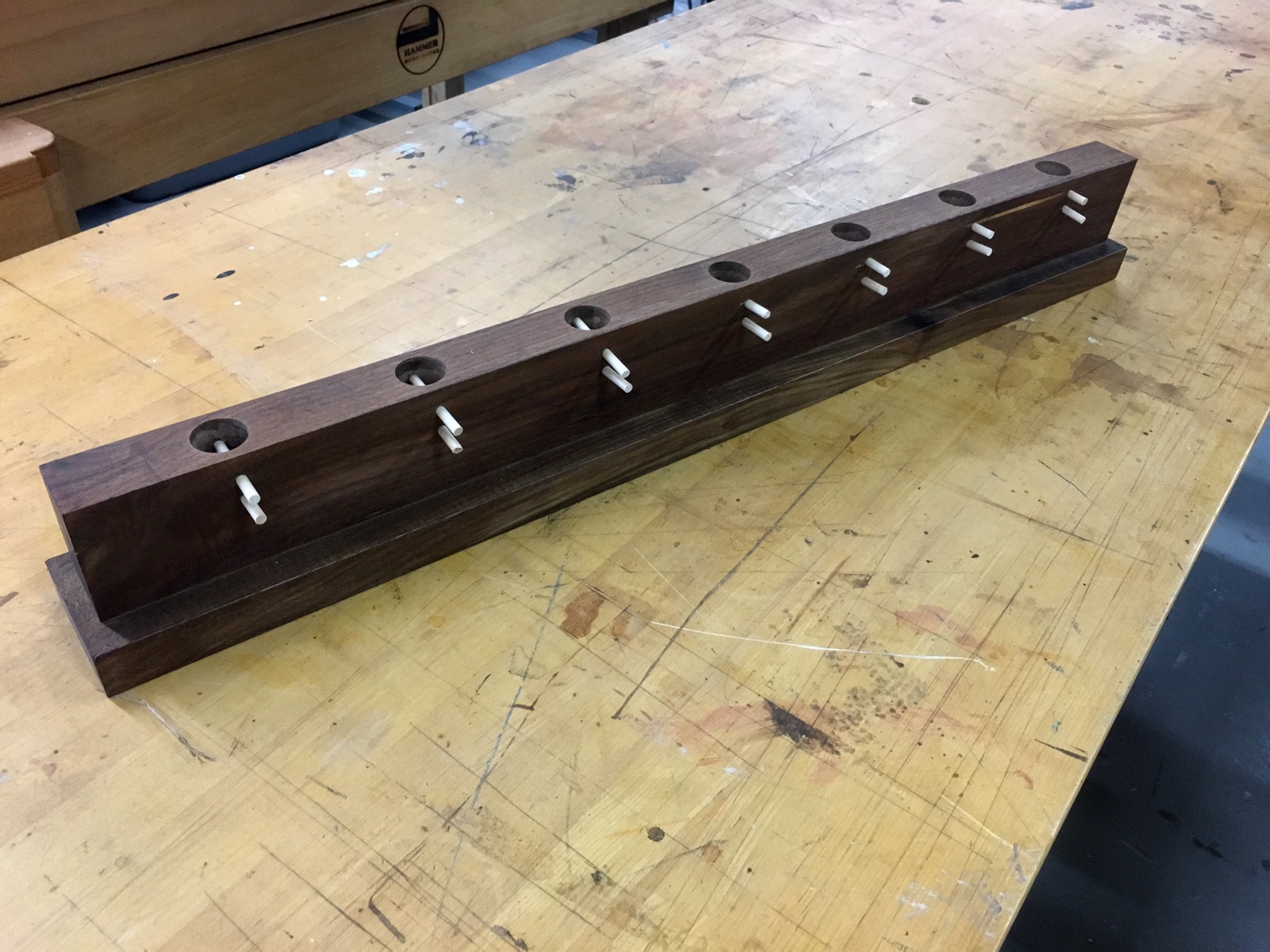 I then created a simple candle-height adjustment system by drilling ¼” holes in the side of each candle well and inserting pegs made from ¼” oak dowels. The dowels make for a nice contrasting color against the walnut, which I think adds to the Asian look I was after.