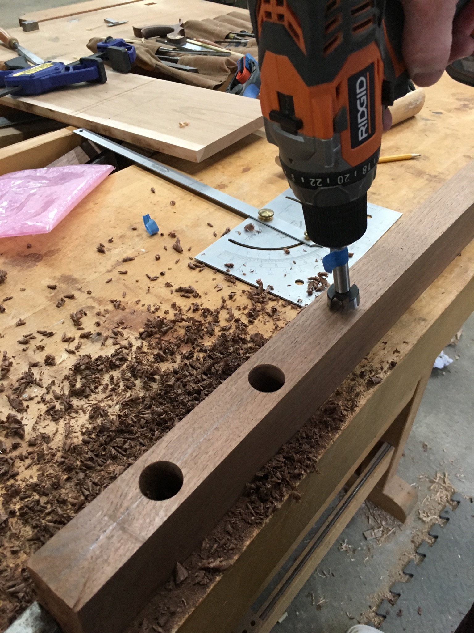 Given the martial arts theme, my design needed a simple and clean Asian look. I used a couple of scrap pieces of walnut – a 29″ piece for the body of the holder and a 30″ piece for a base, which is simply glued and nailed on. I used a 1″ Forstner bit to drill holes for taper candles, leaving a 3″ space between holes.