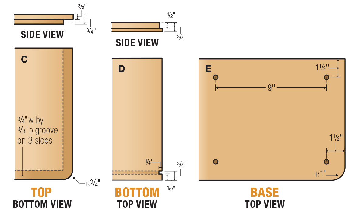 The top and bottom are not identical in size or shape. However, the method of joinery applied is similar. Begin by creating the 3/4“ wide rabbet on the top using a dado setup at the table saw, and then trace a 3/4“ wide radius onto the front side of the panel using a compass. Cut close to your line and refine the edge with a sanding block. Cut more rabbets on to three sides of the bottom panel using your dado setup.