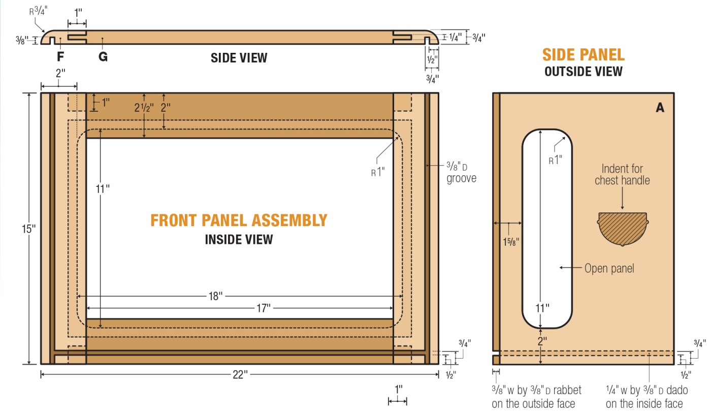 Like the opening on the side panels, a template was used to create the radiused corners on the front panel. After the layout line is established, drill a pilot hole and continue to cut out the shape. Reapply the template and flush-trim the frame using a pattern bit. Swap out the pattern bit for a 1/2“ rabbeting bit. This creates the recess that will house the glass panel. Finish off the cut by squaring up the router corners with a bench chisel, then give the left and right sides of your panel a 3/4“ round-over.