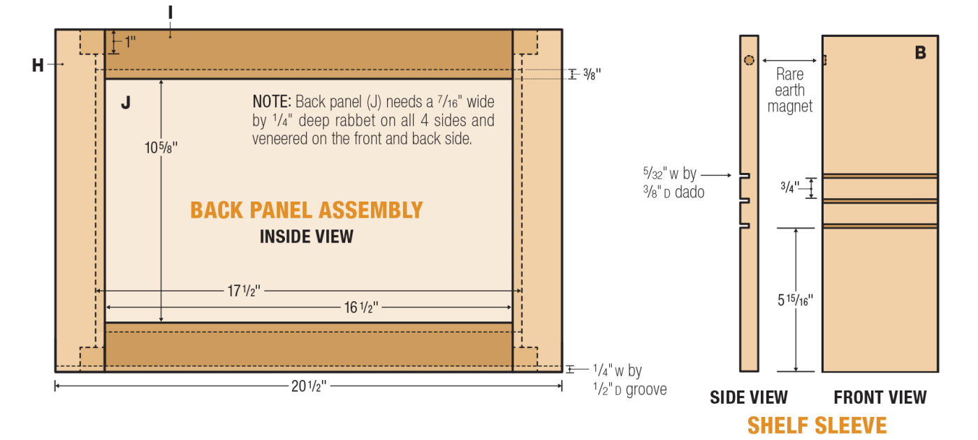 Make two 1/2“ diameter recesses on the back side of each shelf panel— these will be for magnets to hold the back panel in place (which we will discuss later in the article). After this has been completed, glue the shelf panels to the inside of both panels.