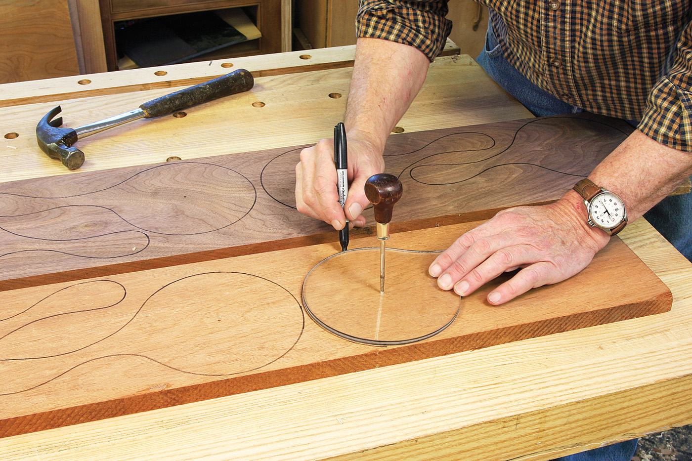 That holds the pattern in place as I trace around it with a felt-tip marker. I can also rotate the pattern around the awl to adjust the way the grain of the wood follows the shape of the handle. At this point, it’s tempting to head to the band saw to cut the blanks to shape, but it’s better to put that off.