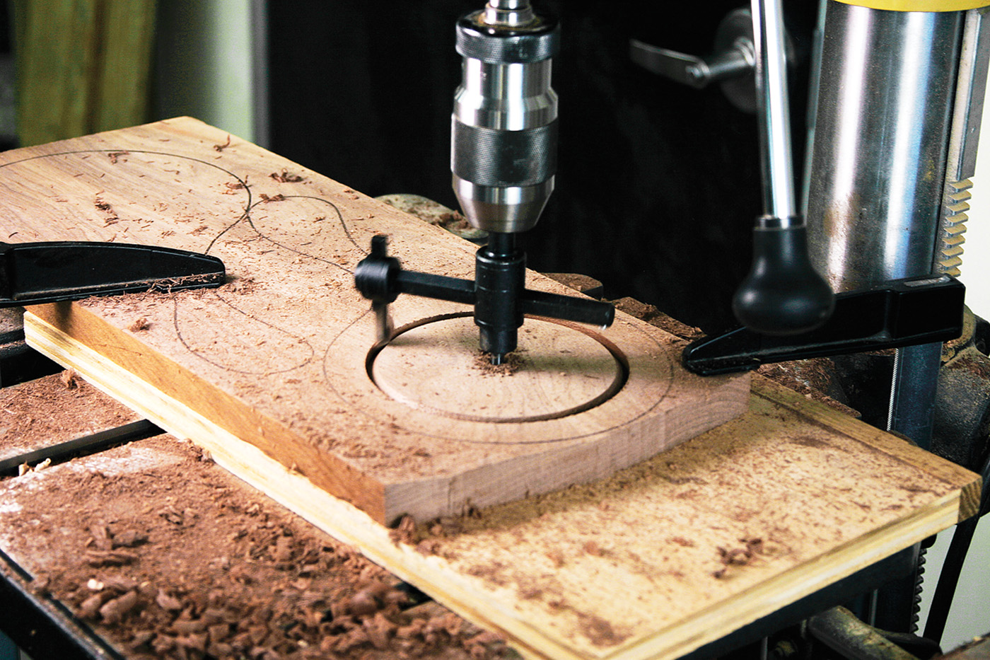 The fly cutter in the drill press is quicker and quieter than the router, even though it is a little on the scary side. I decided to use it to cut the holes, and here are a few tips to make it work well and safely. First and foremost is to clamp the work down to the drill press table. Second is to use the slowest possible speed on the drill press.