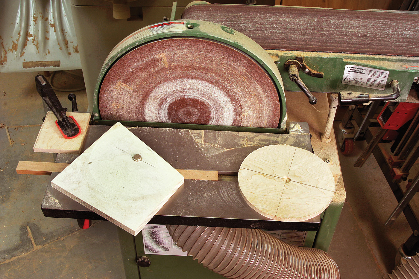 I came up with a gizmo that works with a 12″ disc sander. It’s a piece of 1⁄2“-thick plywood with a 1⁄2“-diameter dowel that sticks up 1⁄8” inch. A shallow hole is drilled with a Forstner bit in the back of each disc-to-be, so it can spin on the dowel. My moment of good thinking in this was to make the plywood plate pivot on a screw that connects the plate to a piece of wood that fits snugly in the miter gauge slot of the sander’s table.