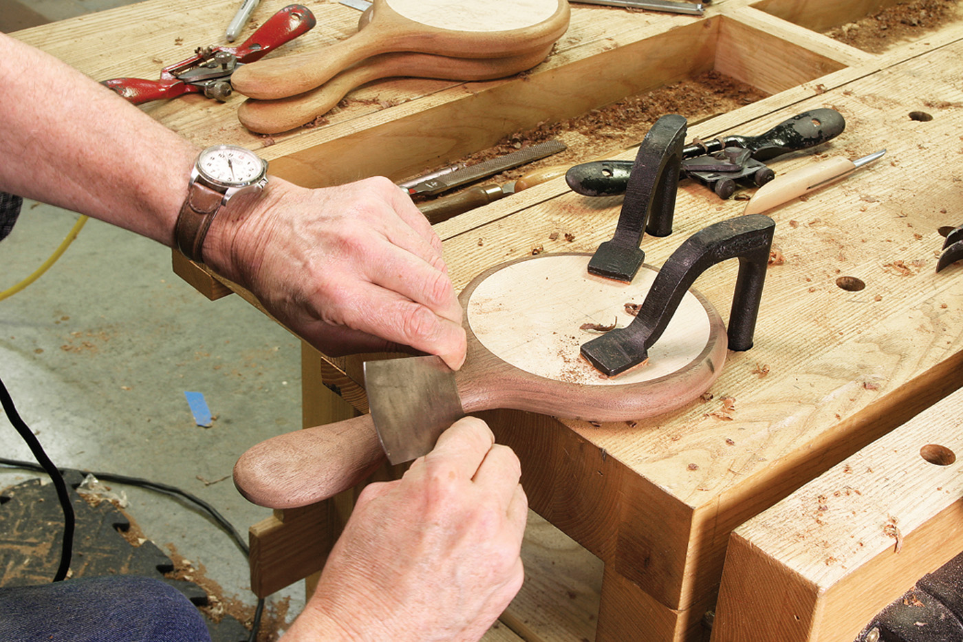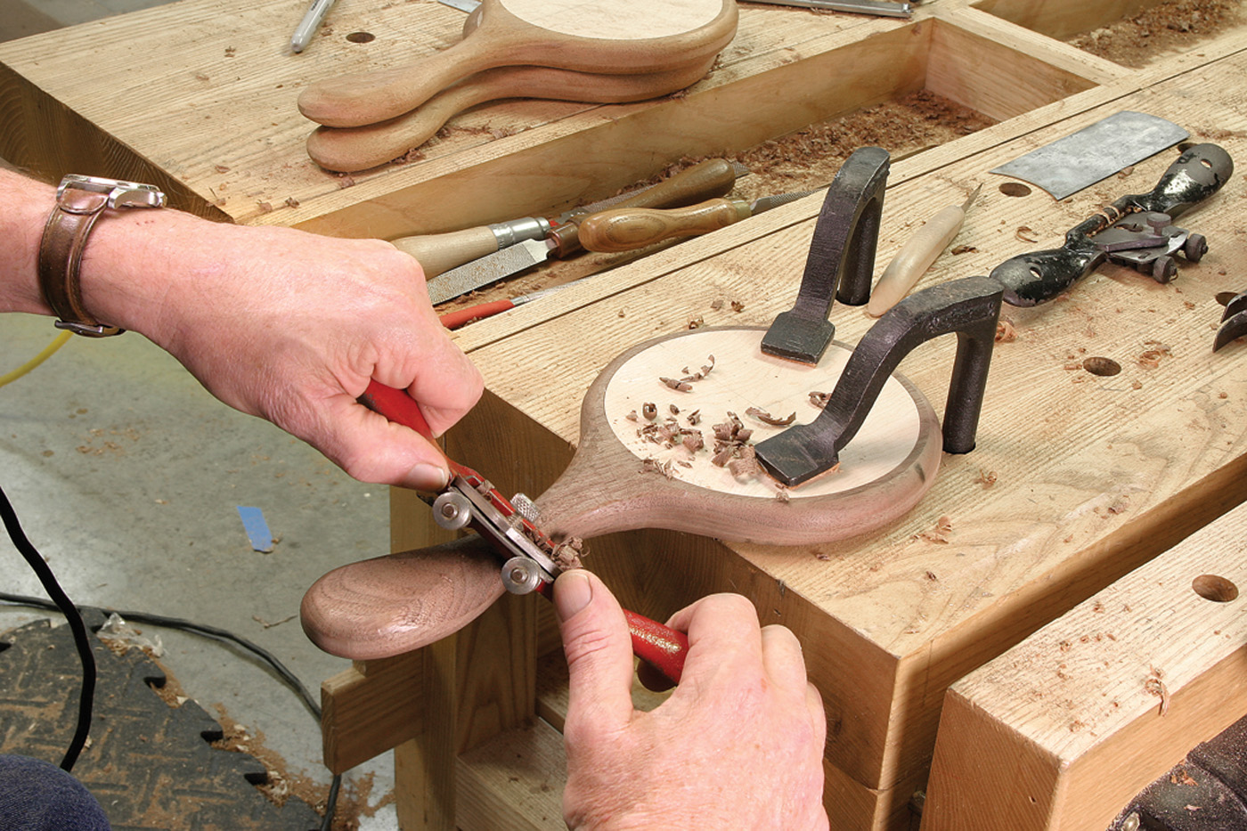 Shaping the handles by hand is the step that makes these mirrors special, and for me it’s the most enjoyable part of the process. The router removes much of the waste, and I use a spokeshave to increase the radius of the curves at the end of the handle, reduce the thickness directly below the mirror and blend the transitions between the machine-shaped and hand-shaped surfaces.