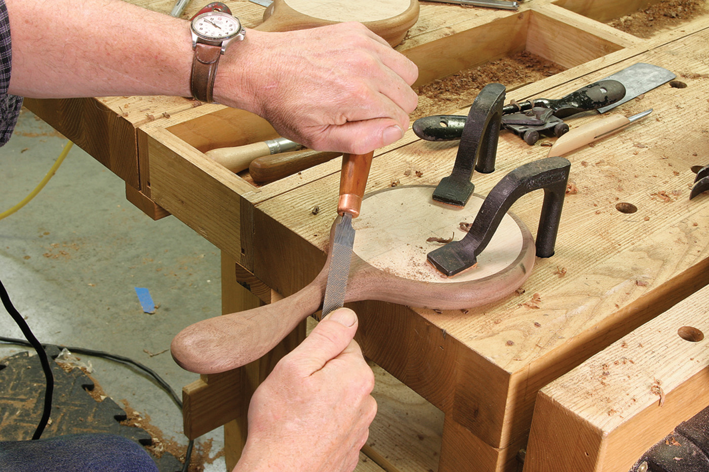 Rough to ready. A series of rasps removes the facets left by the spokeshave, eases the transitions between the curves and refines the shape.