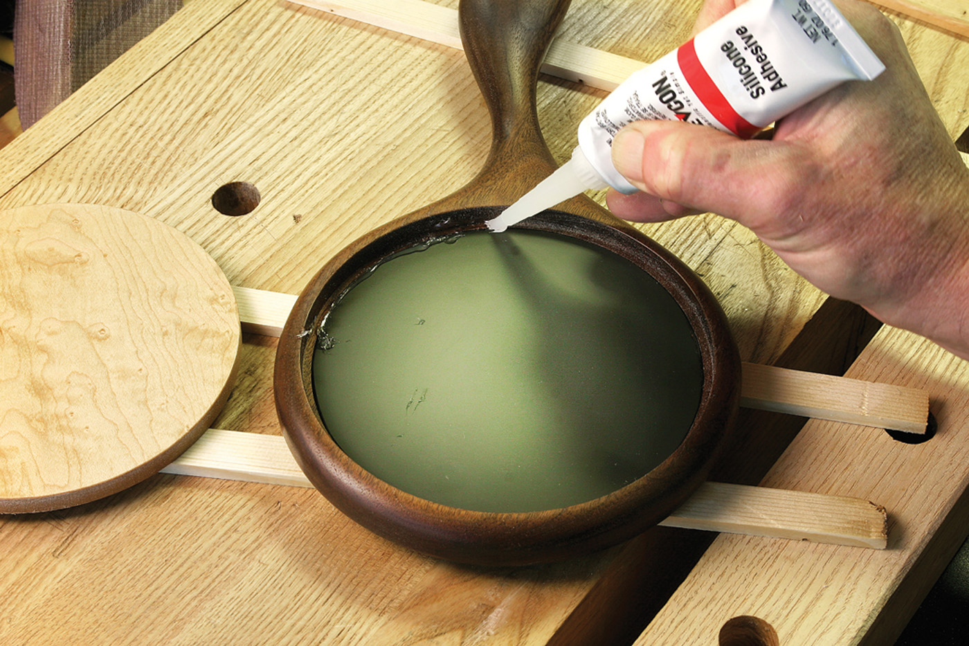 I allow the lacquer to dry thoroughly, then assemble the mirrors. I put the wood face down, then drop the round mirror into the recess. A narrow bead of silicone adhesive is applied to the outer edge of the mirror, then the back is put in position. Use a couple spring clamps to hold the back in place until the adhesive dries.