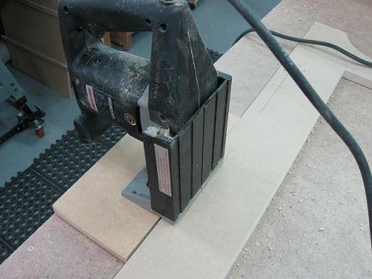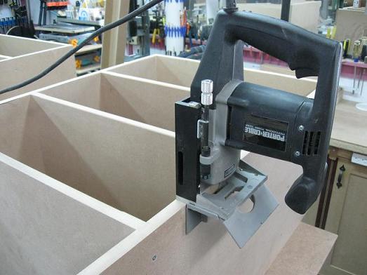 As shown on the picture, I use a scrap piece of wood the same thickness as the face frame to stabilize the tool while cutting. For these cuts I had to remove the fence from the tool.