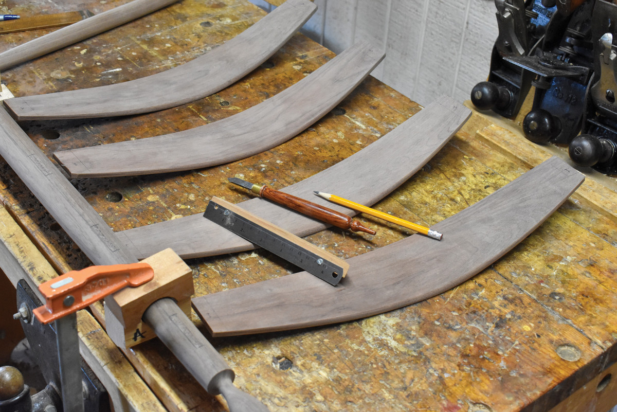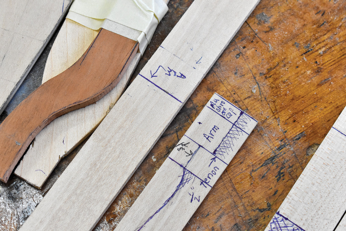 I went into this project knowing that I was going to change the original design in three ways. First because the customer had chosen walnut, rather the hard maple of the original, I decided to beef up the rungs. I increased the diameter of the mid-point of the rungs from 7/8“ to 11/4“ and made a less dramatic increase in post diameter. Second because contemporary Americans are a good-bit wider than their 19th century predecessors, I added 11/4“ to the width of the chair. And third, I decided to change the way the front posts and the arms intersected. On the original chair the front end of the arm didn’t encircle the tenon atop the front post. Instead, there was a screw driven through the front post and into the end grain of the arm. In my judgment, it’s always a mistake to reinforce post-and-rung chairs with metal fasteners because cracks always appear when the flexing wood of a chair in use is side by side with inflexible steel. So I made up several roughed-in arms to see which would eliminate the necessity of a steel fastener without compromising the look of the arms.