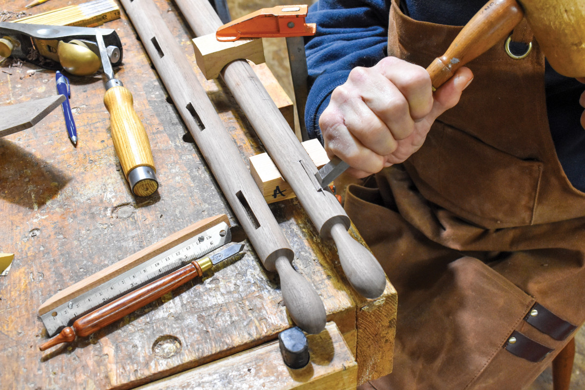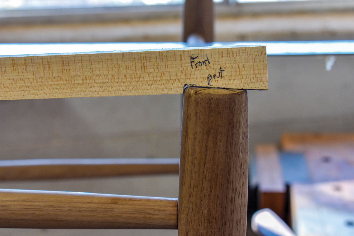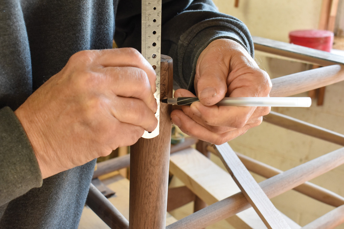 6. To mark mortise locations along these lines, I lay a story stick along a line and transfer the info to the post. (Remember that every chair has a right and left front post and a right and left back post. Make periodic checks to ensure that you don’t end up with two rights or two lefts. Posts drilled that way can’t be made into a usable chair.)