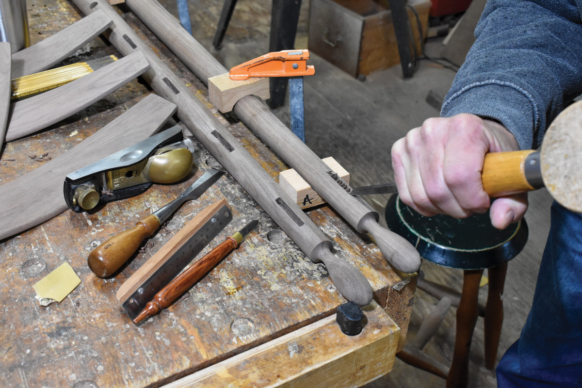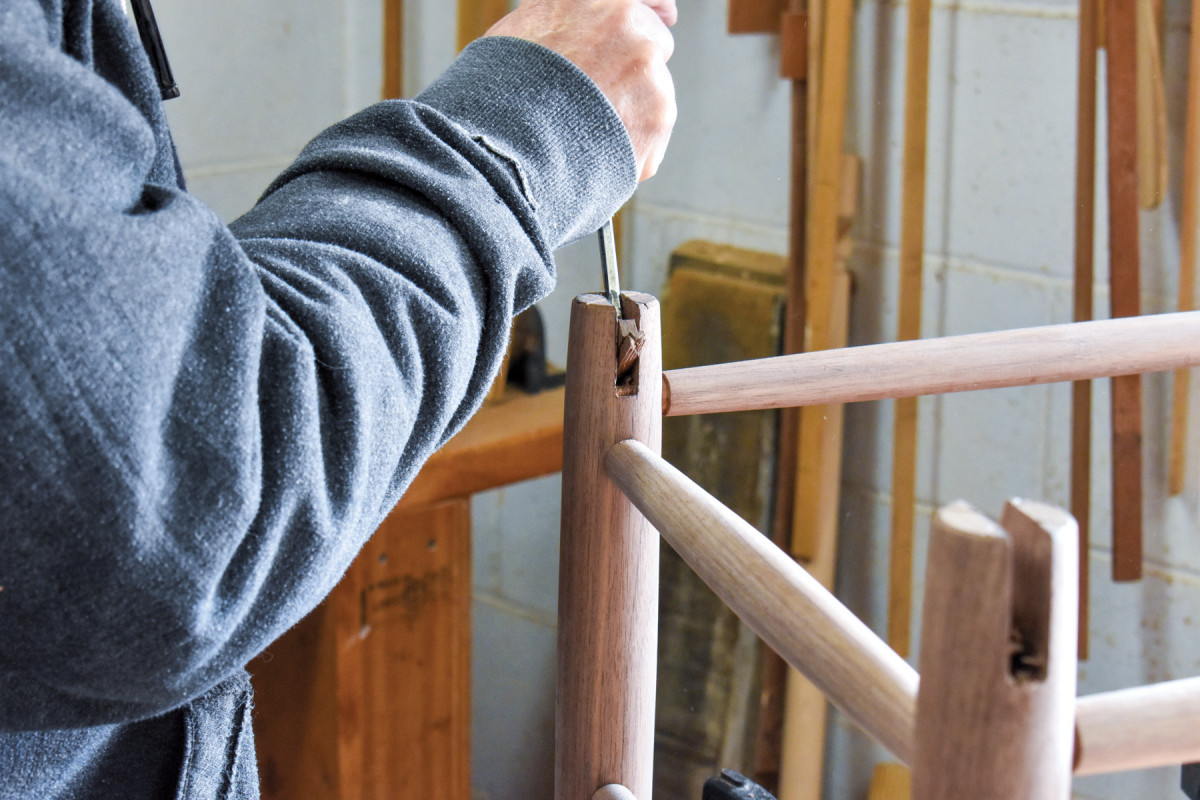 25. The rockers on this chair are 7/16″ thick. I, therefore, mark out 3/8” thick notches. (The extra 1/16″ of width will be pared out while fitting the rockers into the notches.)