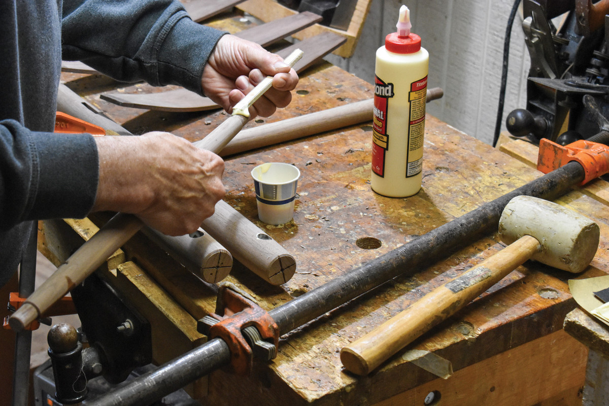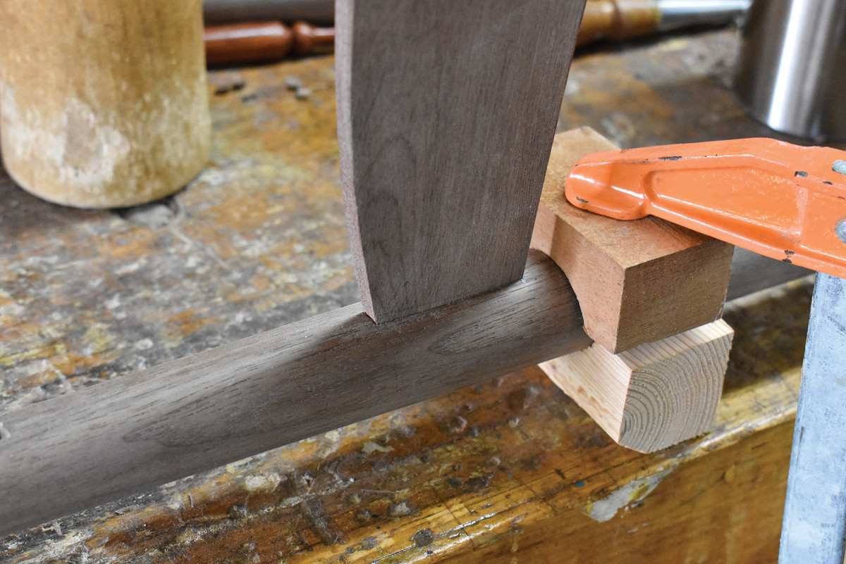 22. Once the tenons have been glued, I push them deep into their mortises with pressure from my pipe clamp.