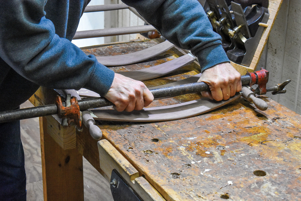 10. Unlike most of the chairs which leave my shop, the back posts on this example are not bent which means I had to steam only my slats. (You can also boil the slats in a pan for 30 minutes to plasticize the wood.) After a half hour in the steamer, I arranged them in this set of molds, creating the bends by closing the vise and using a pipe clamp to ensure that the top of the stack stays tight. *Making bending forms (molds): In the top left of the drawing on page 41, there is a sketch of the amount of bend in the finished slat. When you’re making your forms, please remember that there will be a certain amount of springback when the slats are released from the forms. This means the bend should be slightly exaggerated in your forms.